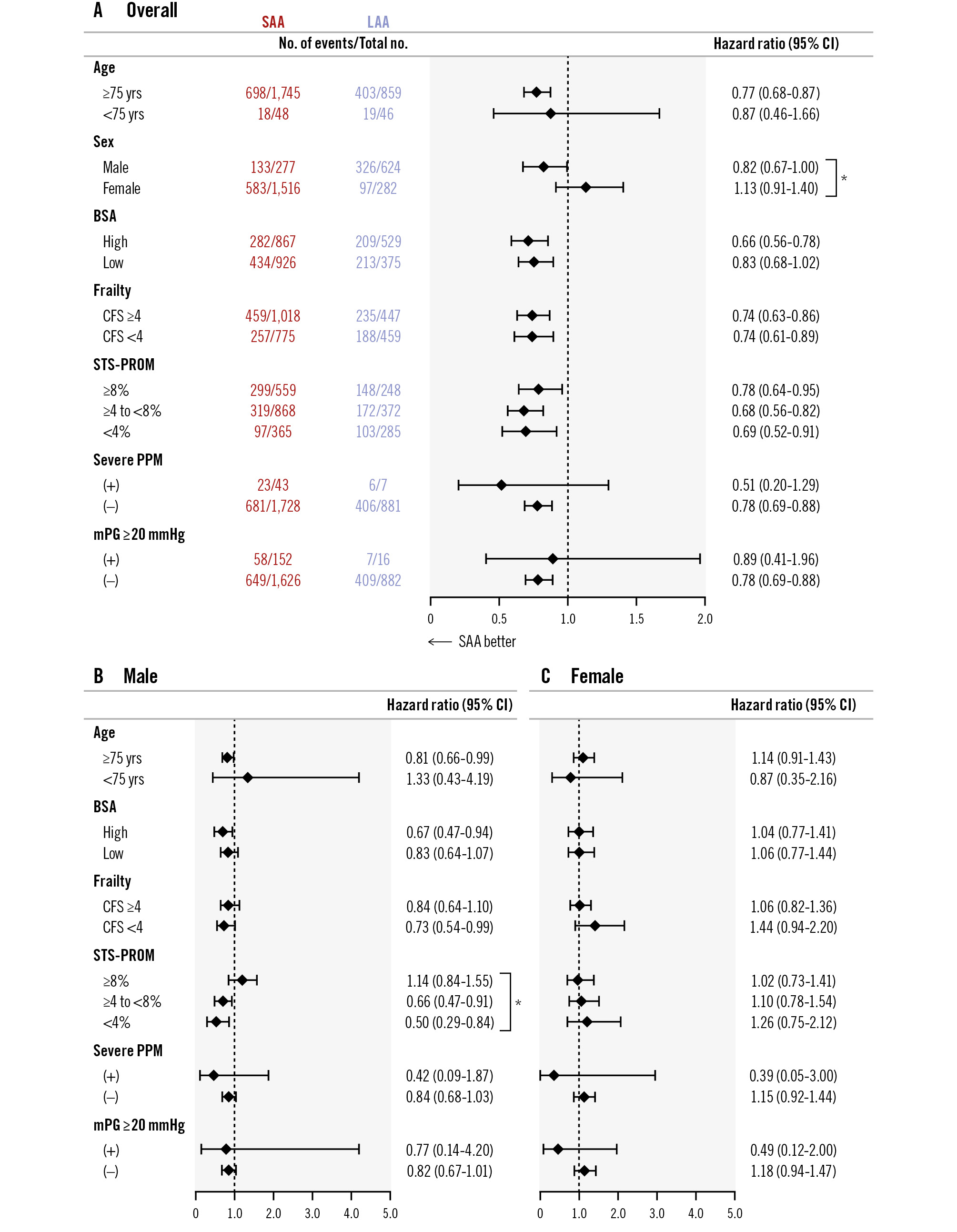 Figure 2. Subgroup analysis of the association between annular size and all-cause mortality. Overall cohort (A), male patients (B), female patients (C). BSA: body surface area; CFS: Clinical Frailty Scale; CI: confidence interval; LAA: large aortic annulus; mPG: mean pressure gradient; PPM: prosthesis-patient mismatch; SAA: small aortic annulus; STS-PROM: Society of Thoracic Surgeons Predicted Risk of Mortality
