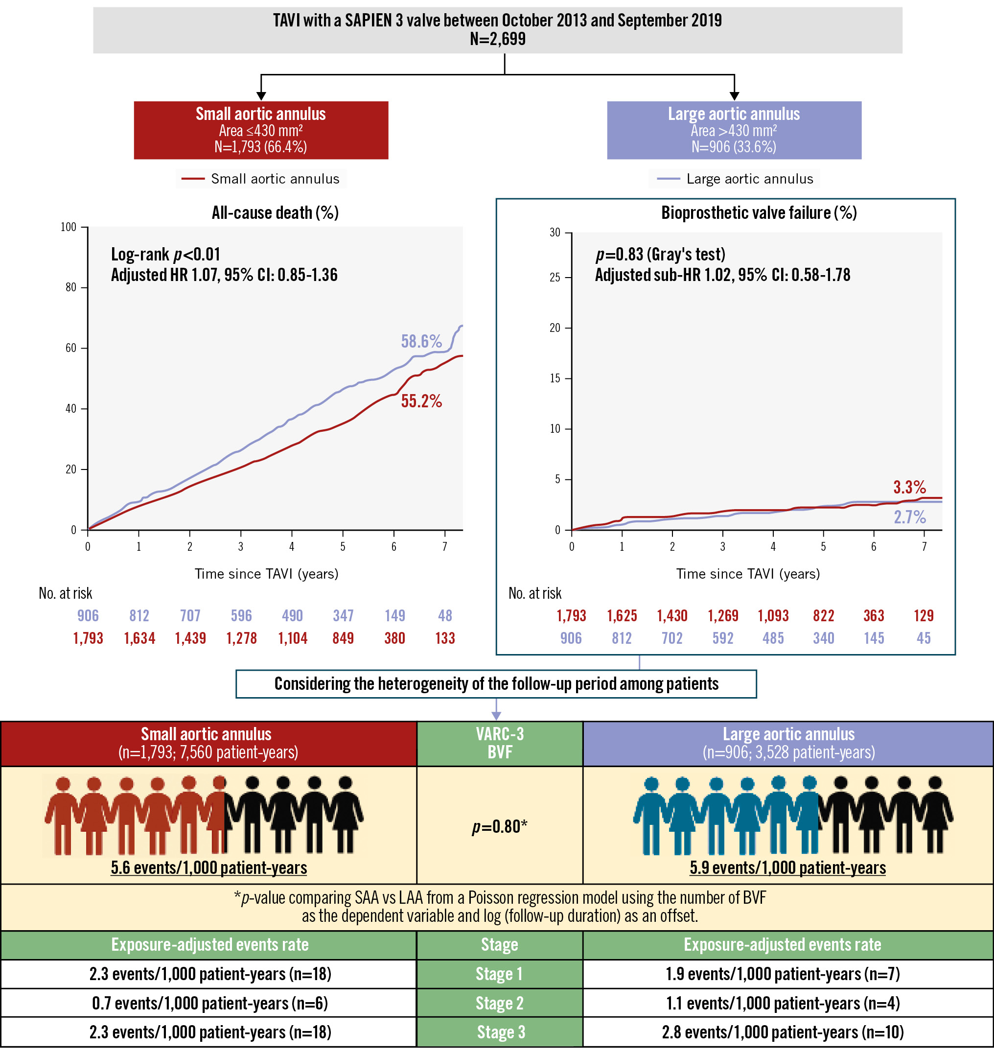 Results: Overall, 66.4% (n=1,793) of patients were categorised into the SAA group. At 7 years after TAVI, the cumulative all-cause mortality showed differences between the SAA and LAA groups (55.2% vs 58.6%), while BVF assessed by Gray’s test was similar between the groups (3.3% vs 2.7%). The Cox multivariable analysis revealed no association between SAA and worse prognosis (hazard ratio 1.07, 95% confidence interval: 0.85-1.36; p=0.56). There were no significant differences in mortality or BVF regarding an mPG ≥20 mmHg, severe PPM, or sex between the SAA and LAA groups (allp>0.05).