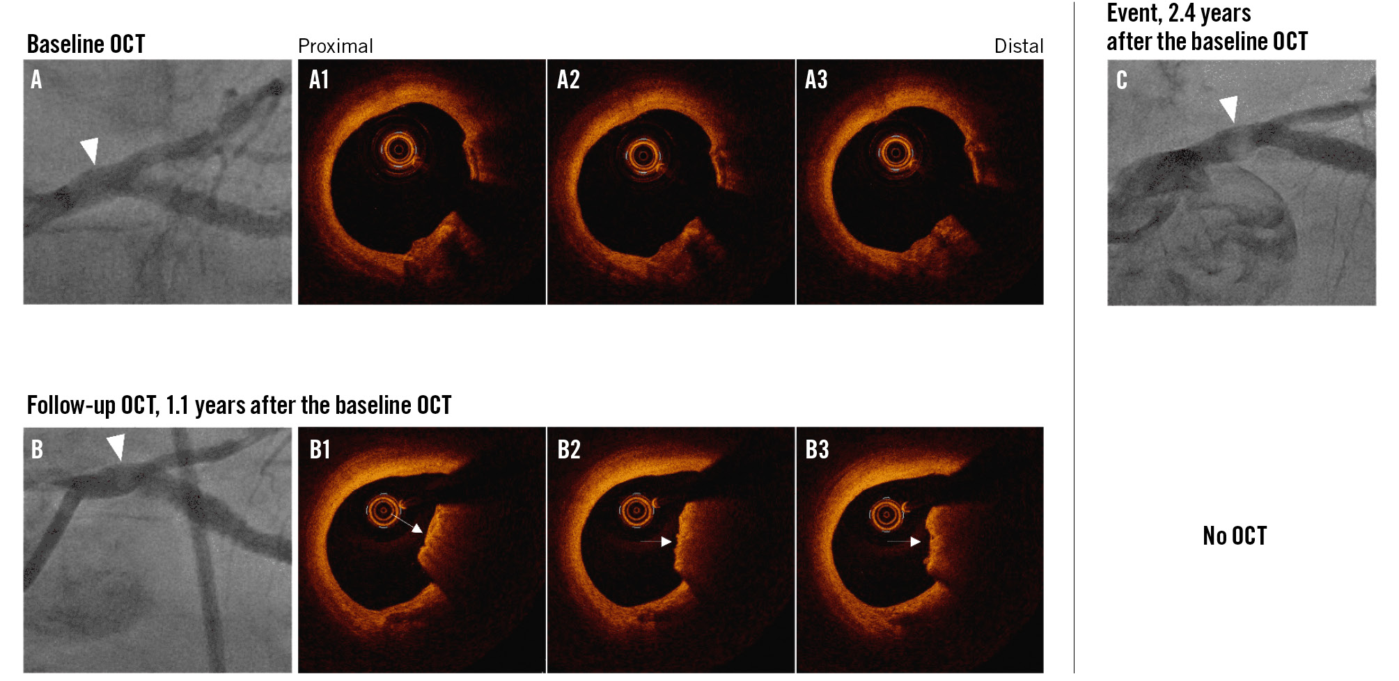 Figure 1. Representative images of new calcified nodule development. A, A1-3) An OCT-imaged untreated calcified lesion of the left main coronary artery at baseline. B, B1-3) A new non-eruptive calcified nodule in the same lesion at follow-up, 1.1 years later. C) About 2.4 years after baseline OCT, an angiographic radiolucent mass, representing a massive, calcified nodule was seen. White arrowheads indicate lesions of interest. White arrows indicate CNs. CN: calcified nodule; OCT: optical coherence tomography