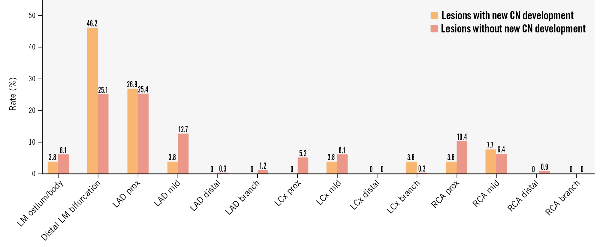 Among the 372 calcified lesions, we identified 26 calcified lesions in 26 patients with a new CN seen on the follow-up OCT, whereas there were 346 calcified lesions in 333 patients that did not develop a new CN. The incidence of a new CN was 7.0% (26/372) (Central illustration), and a new CN was most frequent in the distal left main bifurcation (Figure 2). CNs developed more often in lesions with a greater maximum calcium arc seen on baseline OCT: 14.0% (6/43) in >270°, 11.4% (5/44) in 181-270°, 9.3% (14/151) in 91-180°, and 0.7% (1/134) in ≤90° (Supplementary Figure 3A). The incidence of a new CN tended to increase after 2 years beyond baseline OCT, although there were 7 new CNs (5.0%) within the first year (Supplementary Figure 3B).
