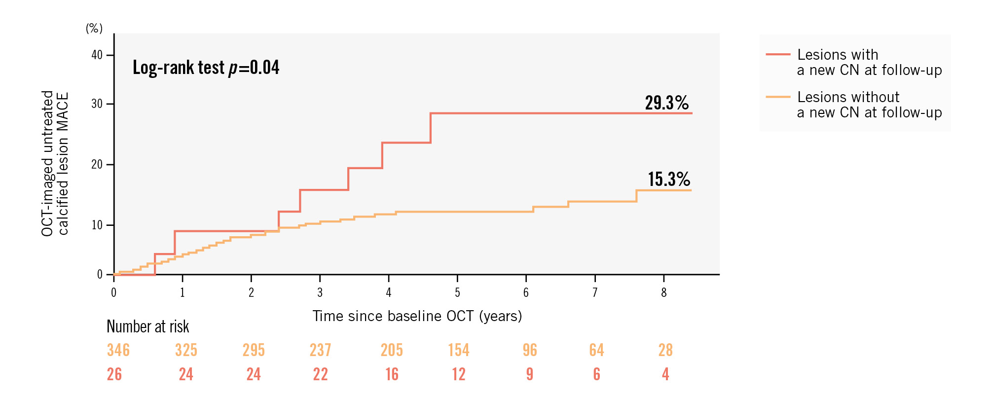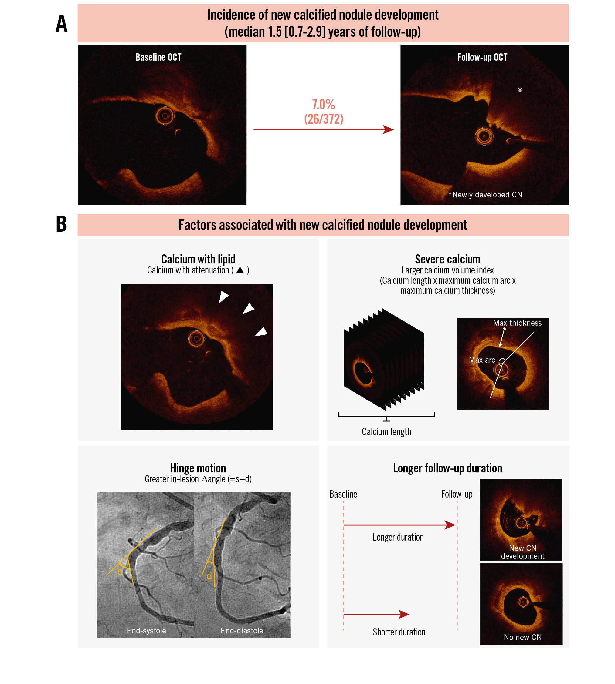 Results: Among 372 untreated calcified lesions, with a median of 1.5 (first and third quartiles: 0.7-2.9) years between baseline and follow-up OCTs, new CNs were observed in 7.0% (26/372) of lesions at follow-up. Attenuated calcium representing residual lipid (odds ratio [OR] 3.38, 95% confidence interval [CI]: 1.15-9.98; p=0.03); log10 calcium volume index (length×maximum arc×maximum thickness; OR 2.76, 95% CI: 1.10-6.95; p=0.03); angiographic Δangle between systole and diastole, per 10° (OR 2.30, 95% CI: 1.25-4.22; p=0.01); and time since baseline OCT, per year (OR 1.36, 95% CI: 1.05-1.75; p=0.02) were all associated with new CN development. Clinical events were revascularisation and/or MI and were more frequent in lesions with versus without a new CN (29.3% vs 15.3%; p=0.04).
