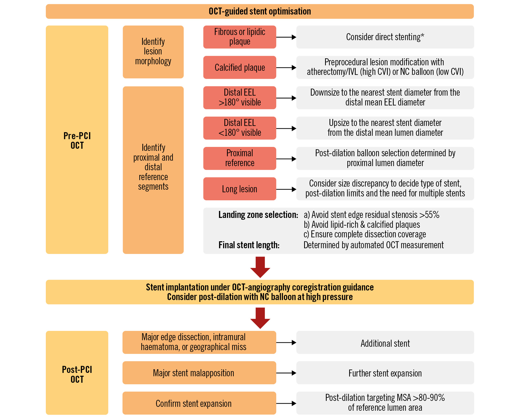 Figure 1. Practical approach for OCT-guided PCI. *While direct stenting might be feasible in the absence of visible calcium, the presence of undilatable or dense fibrous stenosis requires careful evaluation and may necessitate lesion modification prior to stenting. CVI: calcium volume index; EEL: external elastic lamina; IVL: intravascular lithotripsy; IVUS: intravascular ultrasound; MSA: minimum stent area; NC: non-compliant; OCT: optical coherence tomography; PCI: percutaneous coronary intervention