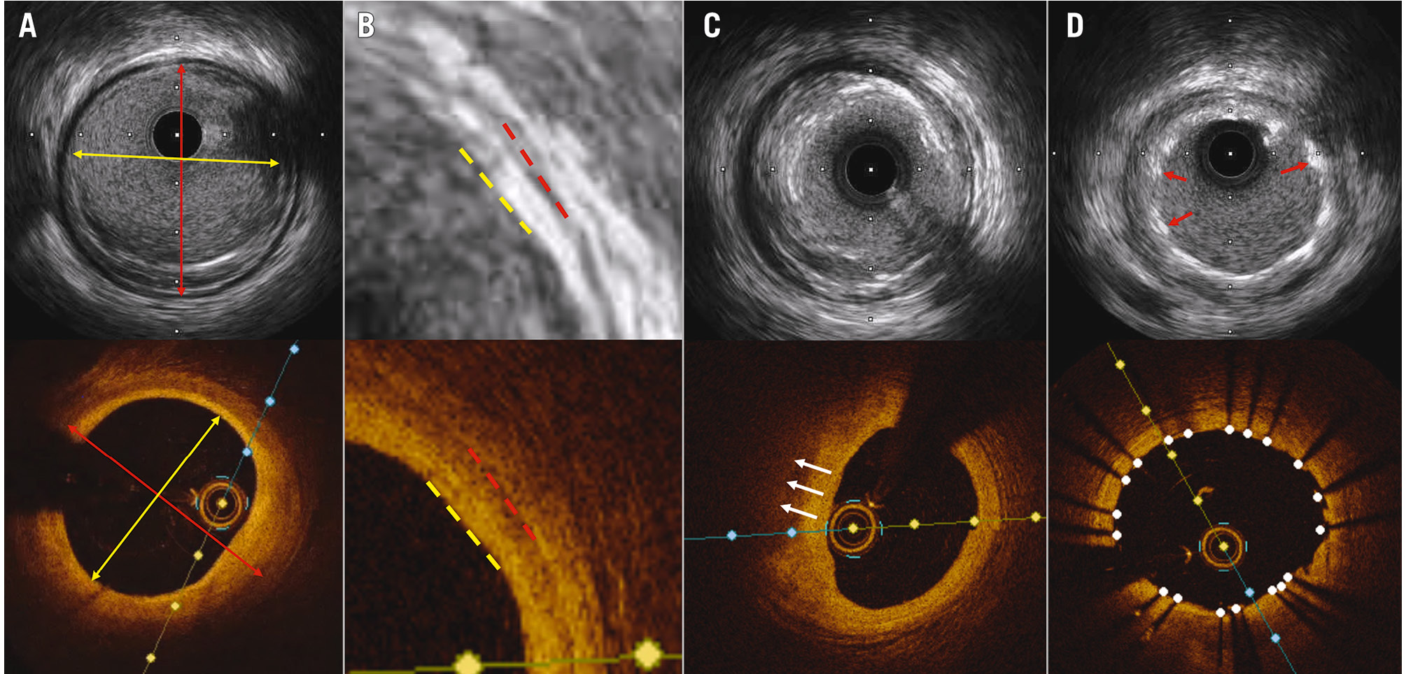 Figure 2. Comparison of IVUS and OCT images in the same coronary lesion. A) IVUS and OCT images of the same coronary lesion, with a lumen area of 7.67 mm2 by IVUS (top), and 7.26 mm2 by OCT (bottom). Red double arrows show EEL diameter measured by IVUS (3.71 mm) and OCT (3.57 mm). Yellow double arrows show lumen diameter (3.16 mm by IVUS and 2.98 mm by OCT). B) Magnified images showing the vessel wall layers with media in IVUS (top, red dashed line), EEL in OCT (bottom, red dashed line), and lumen (yellow dashed lines). C) EEL was visualised by IVUS (top), while plaque attenuation (white arrows) hindered the visualisation of EEL by OCT (bottom). D) Red arrows point at stent struts where the stent area by IVUS was measured as 7.37 mm2 (top). In the OCT image (bottom) with white dots indicating stent struts, the stent area was measured as 7.24 mm2 by OCT. EEL: external elastic lamina; IVUS: intravascular ultrasound; OCT: optical coherence tomography