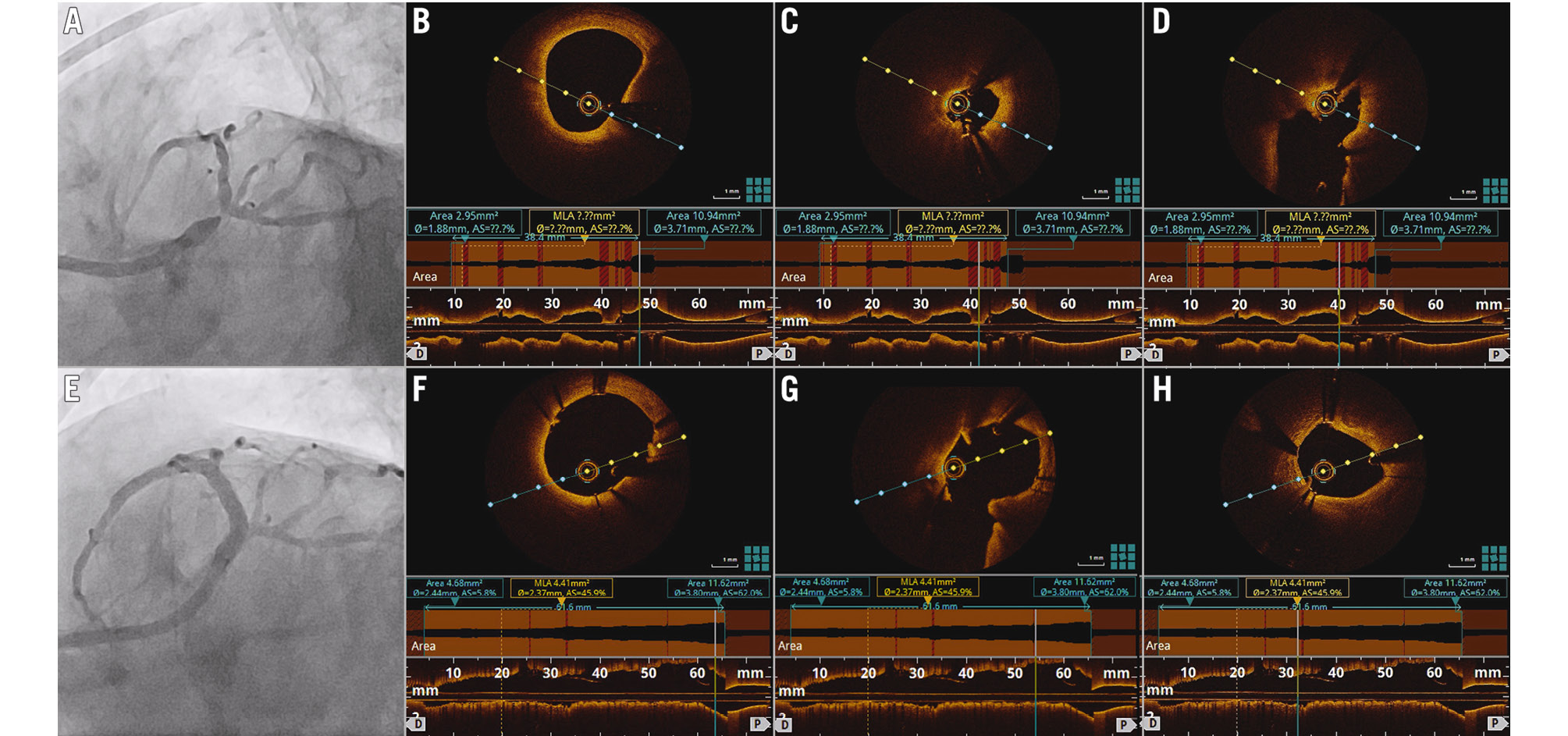 Figure 3. Representative case of OCT-guided PCI for a left main lesion. A) Coronary angiogram showing severe distal left main stenosis. Following predilation with a 2.5 mm non-compliant balloon, OCT imaging showed diffuse stenosis from the distal left main stem to the mid-LAD with a minimal lumen area of 2.95 mm2 (B,C) and a well-opened ostium of the left circumflex, free of disease (D). Two drug-eluting stents of 2.75x38 mm and 2.75x23 mm were implanted in the distal left main to the mid-LAD and dilated with 3.0 mm and 3.75 mm non-compliant balloons. Final angiography and OCT imaging showed a well-apposed proximal stent edge at the left main stem (E,F), well-opened ostium of the left circumflex (G), and an automated minimal stent area measurement of 4.41 mm2 at the distal segment of the mid-LAD (H). LAD: left anterior descending artery; OCT: optical coherence tomography; PCI: percutaneous coronary intervention