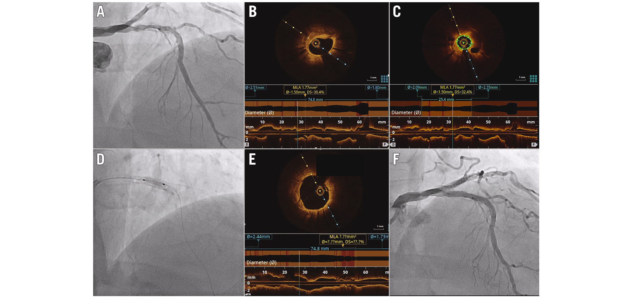 Figure 6. Representative case of OCT-guided PCI for in-stent restenotic lesion. A) Coronary angiogram showing restenosis of the drug-eluting stent that had been implanted in the LAD 13 years earlier. B,C) Baseline OCT revealed calcified neoatherosclerosis with a minimal lumen area of 1.77 mm2. D) Plaque modification with a 3.0 mm cutting and 3.5 mm non-compliant balloon was performed and followed by 60 seconds of inflation of the 3.5 mm paclitaxel-coated balloon. Final OCT (E) and angiography (F) showed sufficient luminal gain with a minimal lumen area of 8.91 mm2. LAD: left anterior descending artery; OCT: optical coherence tomography; PCI: percutaneous coronary intervention