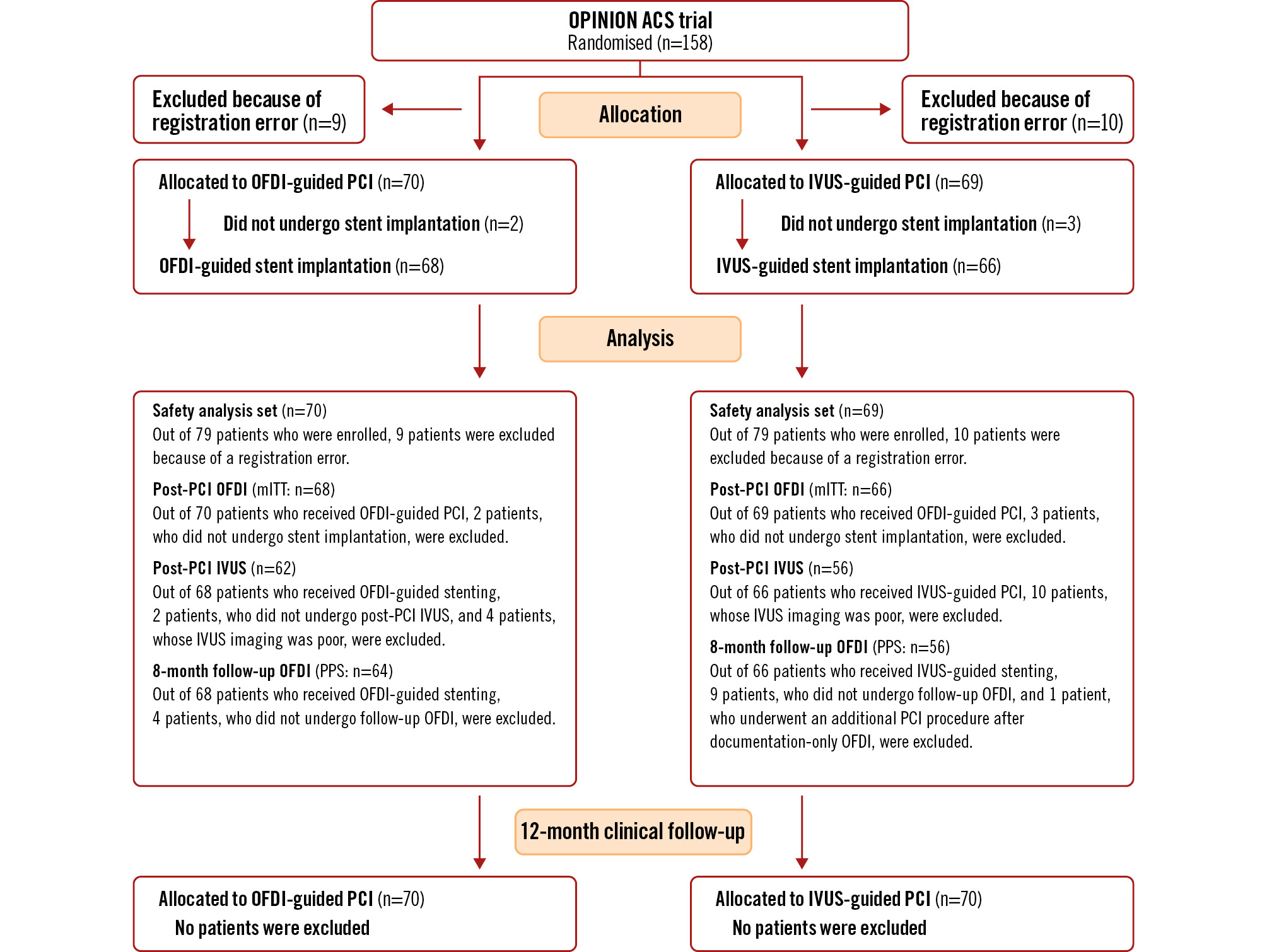 METHODS: OPINION ACS is a multicentre, prospective, randomised, non-inferiority trial that compared OFDI-guided PCI with IVUS-guided PCI using current-generation drug-eluting stents in ACS patients (n=158). The primary endpoint was in-stent minimum lumen area (MLA), assessed using 8-month follow-up OFDI.