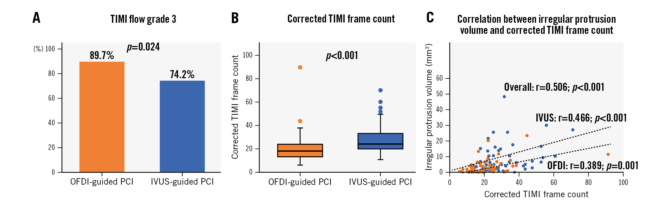 Post-PCI angiographic analysis revealed that the prevalence of Thrombolysis in Myocardial Infarction (TIMI) flow grade 3 was significantly higher in the OFDI-guided PCI group than in the IVUS-guided PCI group (Supplementary Table 2, Figure 2). Coronary flow after PCI, as assessed by corrected TIMI frame counts, was significantly better in the OFDI-guided PCI group than in the IVUS-guided PCI group (Figure 2). There was a significant positive relationship between the corrected TIMI frame count and the volume of irregular protrusion on post-PCI OFDI.
