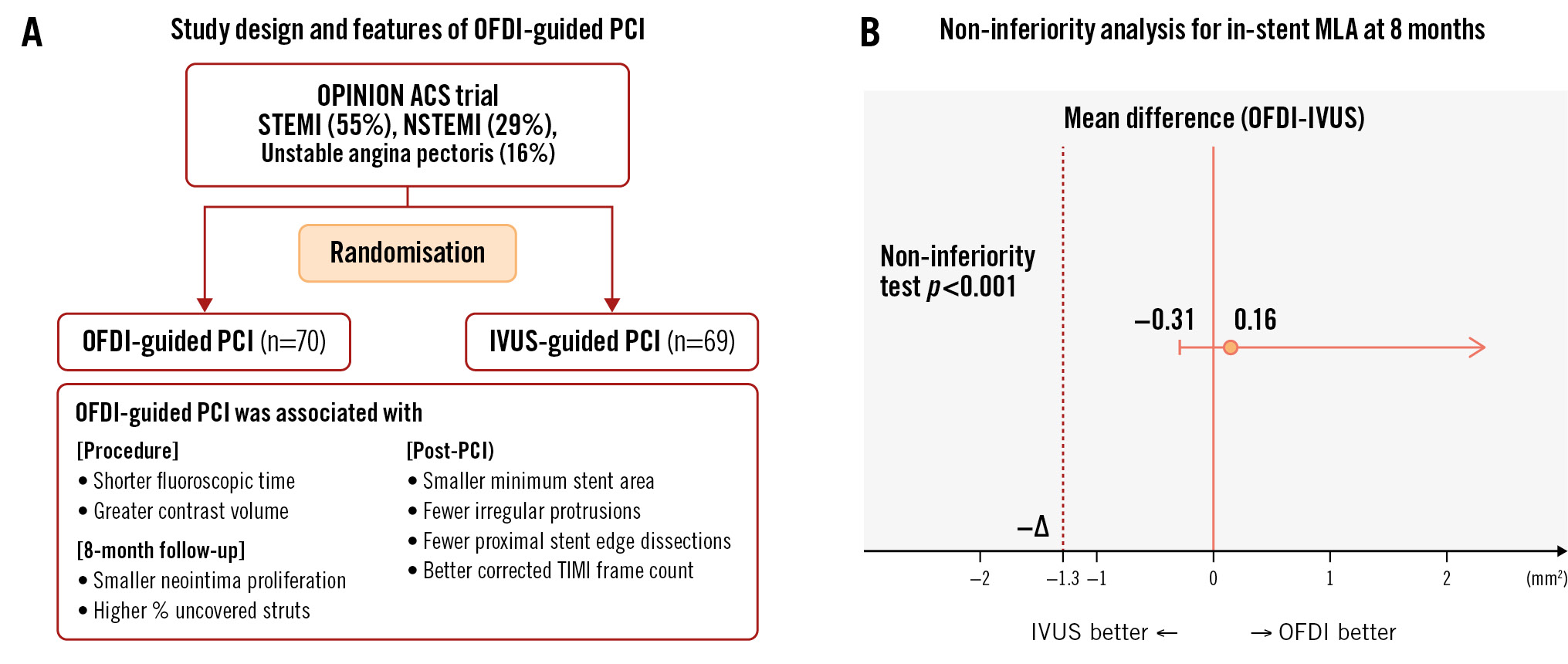 Central illustration. OFDI versus IVUS in percutaneous coronary intervention for acute coronary syndrome. A) OPINION ACS: study design and features of OFDI-guided PCI. B) Primary endpoint result. ACS: acute coronary syndrome; IVUS: intravascular ultrasound; MLA: minimum lumen area; NSTEMI: non-ST-segment elevation myocardial infarction; OFDI: optical frequency domain imaging; PCI: percutaneous coronary intervention; STEMI: ST-segment elevation myocardial infarction; TIMI: Thrombolysis in Myocardial Infarction
