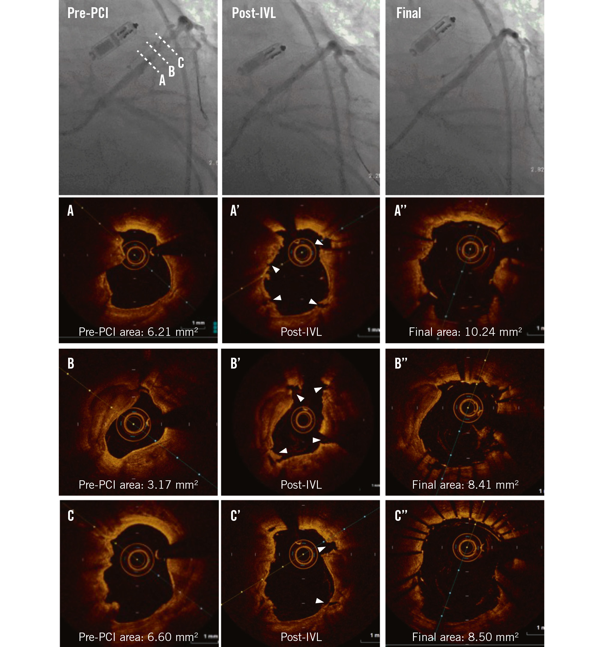 Figure 1. Impact of intravascular lithotripsy on a calcified nodule. Pre-PCI angiography identifies a calcified lesion in the left anterior descending artery. Coregistered OCT cross-sections represent (A) the non-eruptive calcified nodule, (B) maximum calcification, and (C) the distal segment of the calcified lesion. A’-C’) Coregistered images following IVL. Note the multiple fractures (white arrowheads). A’’-C’’) Coregistered images following stent implantation showing sufficient luminal gains. IVL: intravascular lithotripsy; MLA: minimal lumen area; OCT: optical coherence tomography; PCI: percutaneous coronary intervention