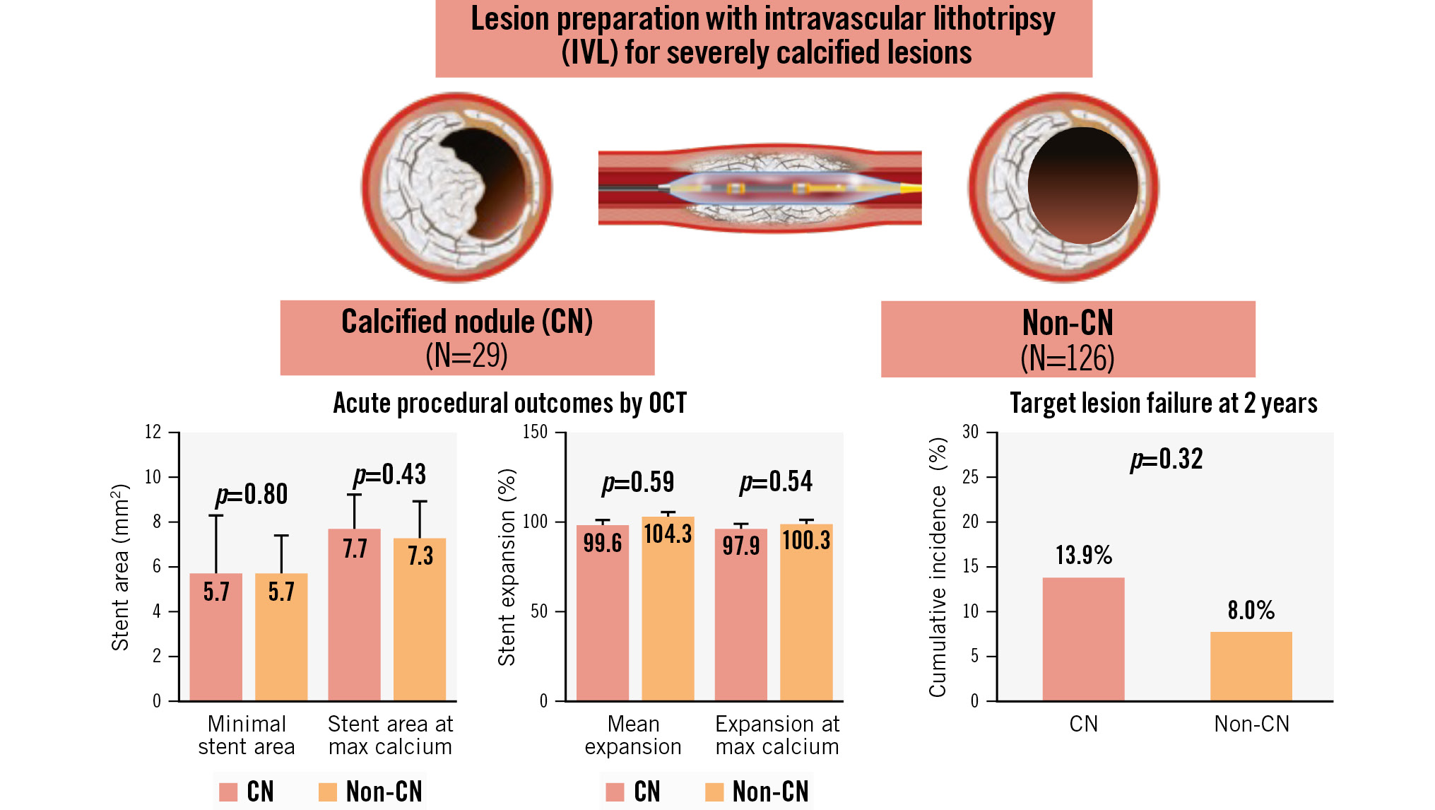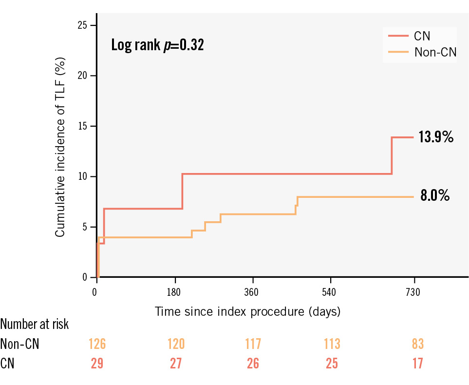 Results: A CN was identified in 18.7% (29/155) of lesions. When comparing lesions with and without CNs, there were no significant differences in preprocedure minimal lumen area or diameter stenosis; however, the mean calcium angle and calcium volume were greater in CN lesions. Despite a higher calcium burden, the final minimal stent area (CN: 5.7 mm2 [interquartile range [IQR] 4.4, 8.3] vs non-CN: 5.7 mm2 [IQR 4.7, 7.2]; p=0.80) and stent expansion (CN: 79.3% [IQR 64.3, 87.0] vs 80.2% [IQR 68.9, 92.4]; p=0.30) were comparable between the two groups. In the CN group, the final stent area and expansion at CN sites were 7.6 mm2 (IQR 5.5, 8.5) and 89.7% (IQR 79.8, 102.5), respectively. The cumulative incidence of TLF at 2 years was 13.9% and 8.0% in the CN and non-CN groups, respectively (p=0.32).