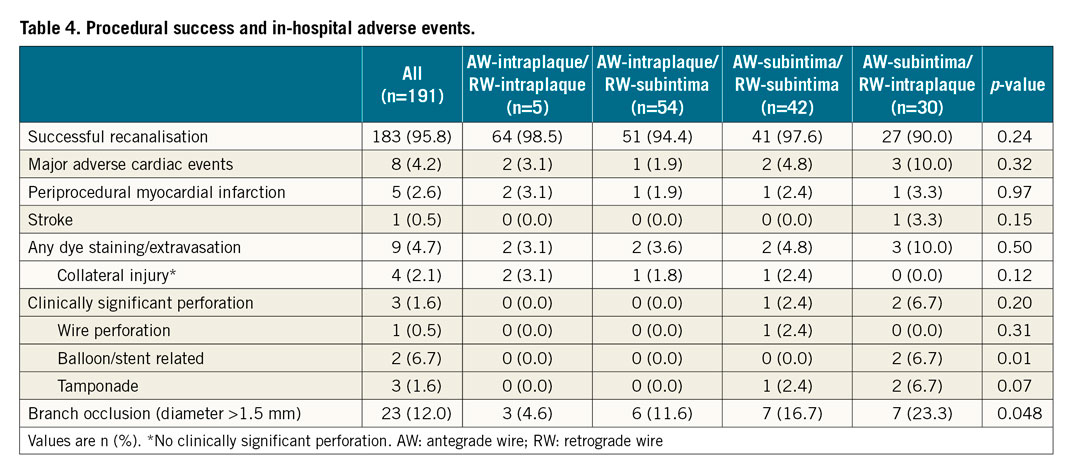 There was no death, in-hospital repeat revascularisation, or probable/definite stent thrombosis. There were three clinically significant perforations: two cases were treated by covered stent and one by prolonged balloon inflation (Table 4). Clinically significant perforation and tamponade were numerically higher in AW-subintima/RW-intraplaque (6.7%), and branch occlusion was the most common in the AW-subintima/RW-intraplaque (23.3%).