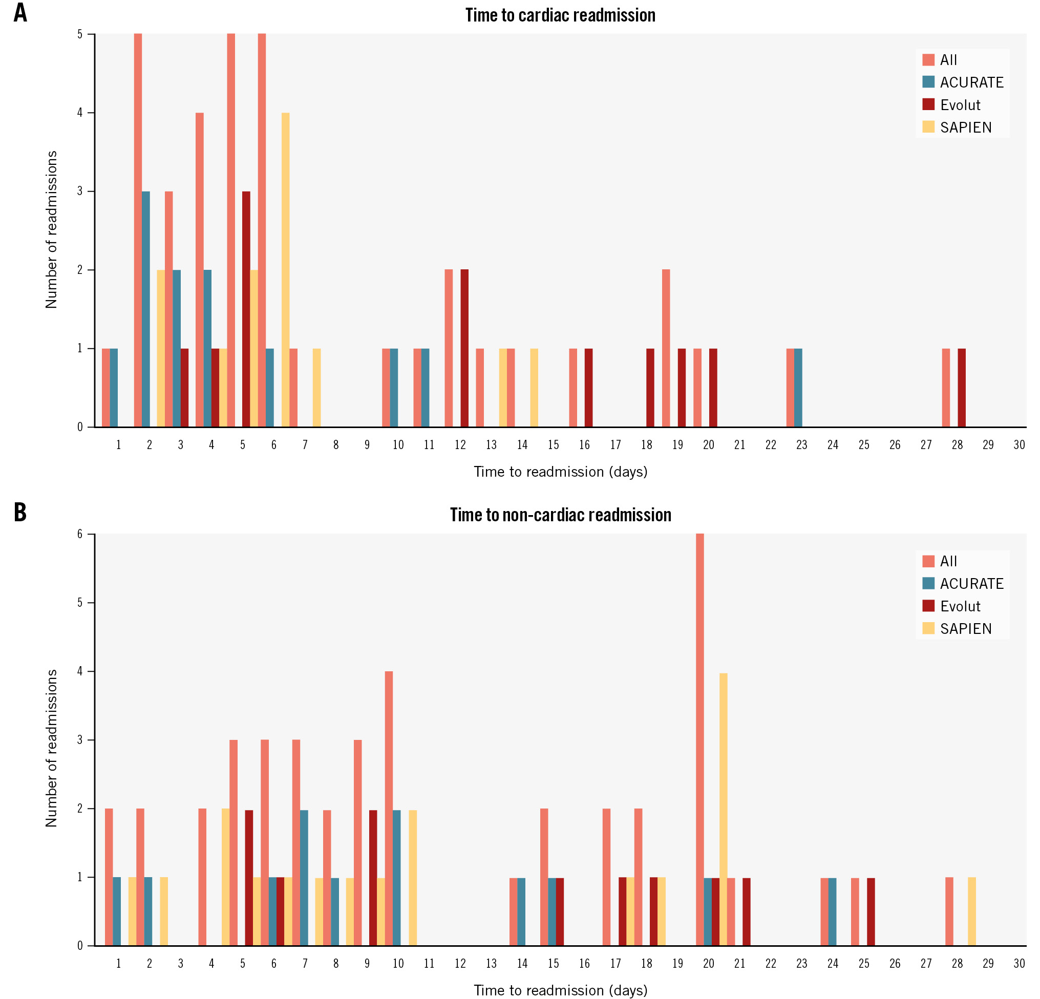 Results: A total of 963 all-comer patients (ACURATE=264, Evolut=306, and SAPIEN=393) were included in this study. ACURATE patients were older (p<0.001) and included a greater proportion of females (p<0.001), whereas Evolut patients had a higher risk profile as assessed by the Society of Thoracic Surgeons score (p=0.01). There were no differences between the groups in terms of right or left bundle branch block (p=0.75). At 30 days, the overall readmission rate was 8%, and there were no differences in cardiac (ACURATE 4.6% vs Evolut 4.2% vs SAPIEN 3.1%; p=0.56) or non-cardiac readmissions (ACURATE 4.6% vs Evolut 3.3% vs SAPIEN 4.6%; p=0.64). Readmission for new PPI was 2.7%, 1.0% and 1.8% (p=0.32) and for heart failure (HF) was 1.5%, 2.0% and 1.3% (p=0.76) in ACURATE, Evolut and SAPIEN patients, respectively. The IPTW propensity score model followed by modified Poisson regression indicate that, using ACURATE as the reference, no significant differences were found in 30-day readmissions (relative risk [RR] 0.76, 95% confidence interval [CI]: 0.38-1.52; p=0.38 for Evolut and RR 0.74, 95% CI: 0.44-1.22; p=0.28 for SAPIEN).