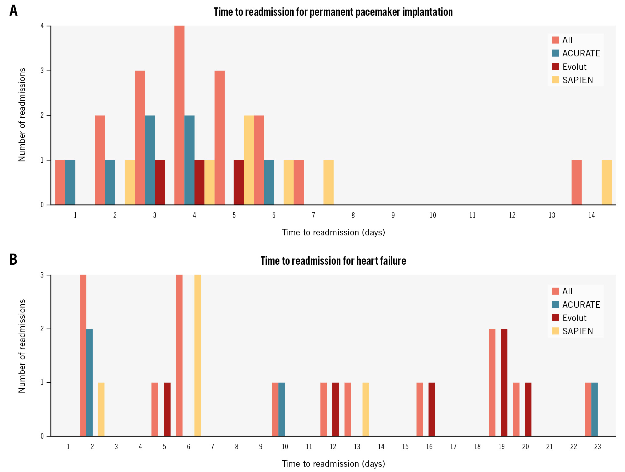The paradigm shift of ED/NDD pathways after TAVI has raised some concerns about shifting the ultra-short LOS at the cost of early readmissions for PPI – in other words, shifting the timing of PPI. Ream et al20 discharged pacemaker-naïve patients after TAVI with a real-time ambulatory event monitor and found delayed (>48 hours) high-grade atrioventricular block (AVB) that required PPI in 10% of patients, and the median time to high-degree AVB was 6 days (range 3 to 24 days) after TAVI20. From this perspective, our time to readmission for PPI shows a peak time on day 4 after discharge, and, again, only 1 patient was readmitted with CAVB in the afternoon of day 1 (day 2, strictly speaking for administrative purposes) after discharge (Figure 3A). This patient had a normal ECG at baseline and no periprocedural conduction abnormalities or abnormalities on telemetry monitoring (criteria for NDD). In other words, only 1 (out of the 963 patients, 0.1%) readmission would have been avoided if the patient had remained in the hospital for 48-72 hours following TAVI.