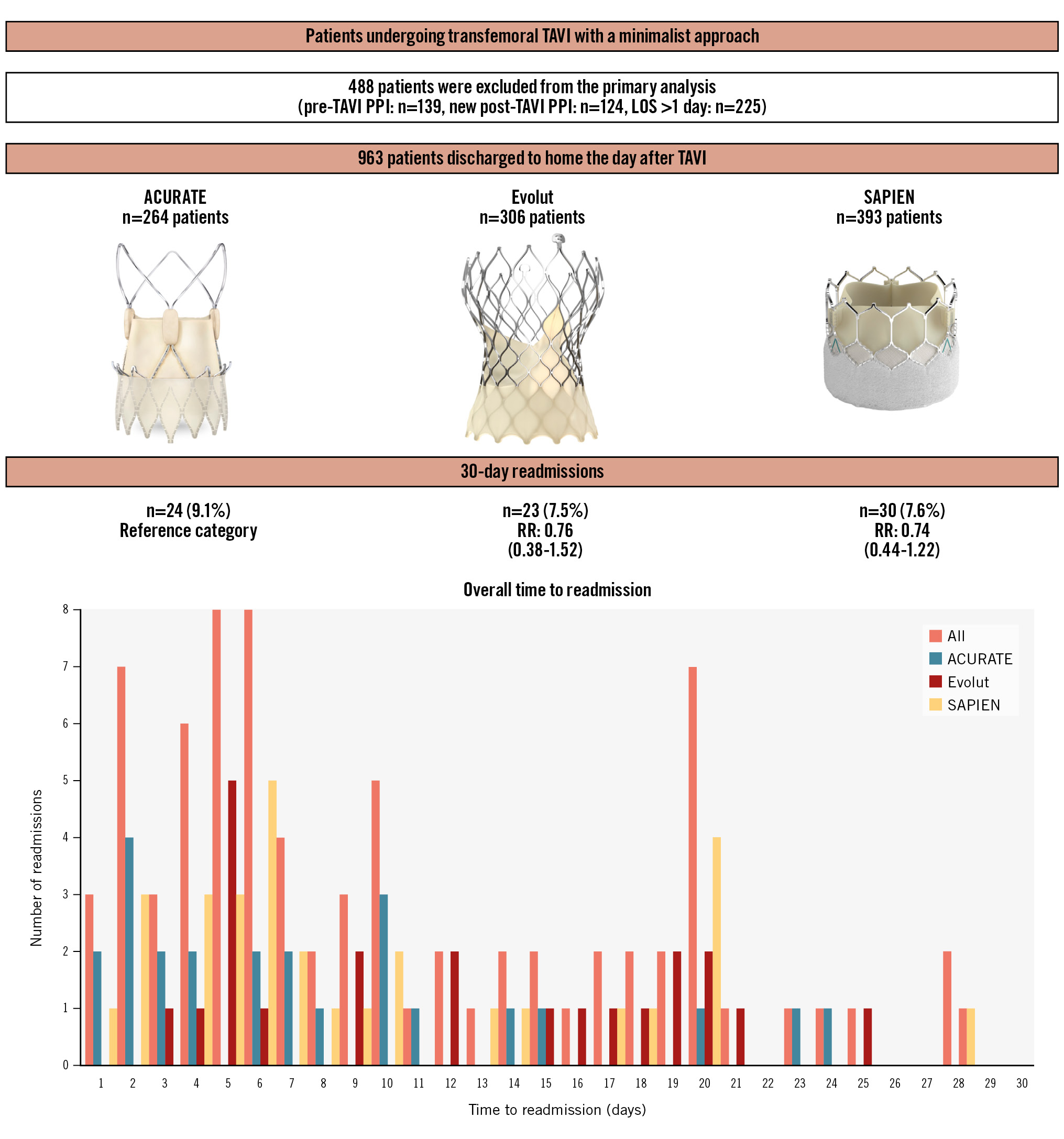 Central illustration. Readmission rates after a next-day discharge pathway following TAVI. An IPTW propensity score model followed by modified Poisson regression indicate that, using ACURATE as the reference, no significant differences were found in 30-day readmissions (RR 0.76, 95% CI: 0.38-1.52; p=0.38 for Evolut and RR 0.74, 95% CI: 0.44-1.22; p=0.28 for SAPIEN). Images were provided and reproduced courtesy of Boston Scientific Corporation ©2024, Medtronic Inc. ©2024 and Edwards Lifesciences LLC, Irvine, CA. ©2024. ACURATE: ACURATE neo/neo2; CI: confidence interval; Evolut: Evolut PRO/PRO+/FX; IPTW: inverse probability of treatment-weighted; LOS: length of stay; PPI: permanent pacemaker implantation; RR: risk ratio; SAPIEN: SAPIEN 3/Ultra; TAVI: transcatheter aortic valve implantation