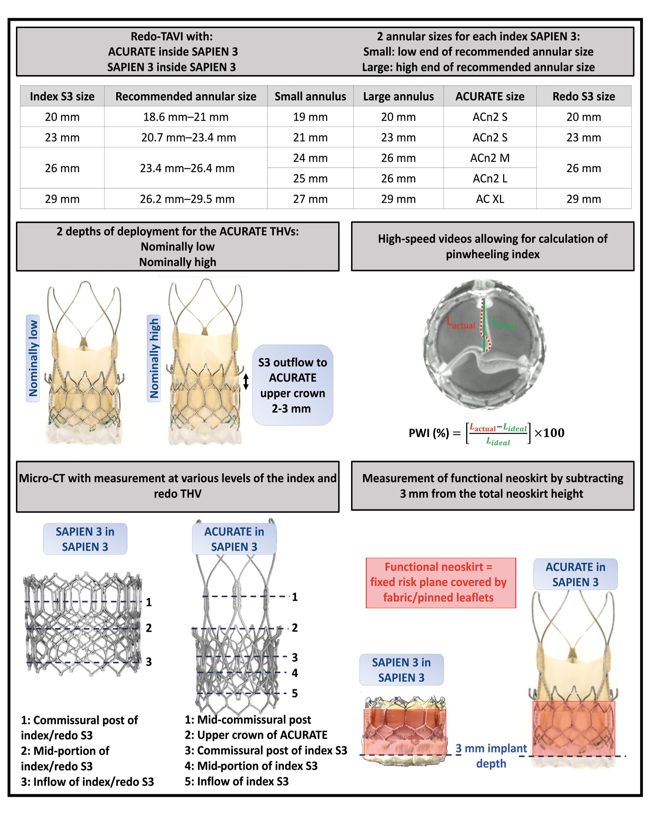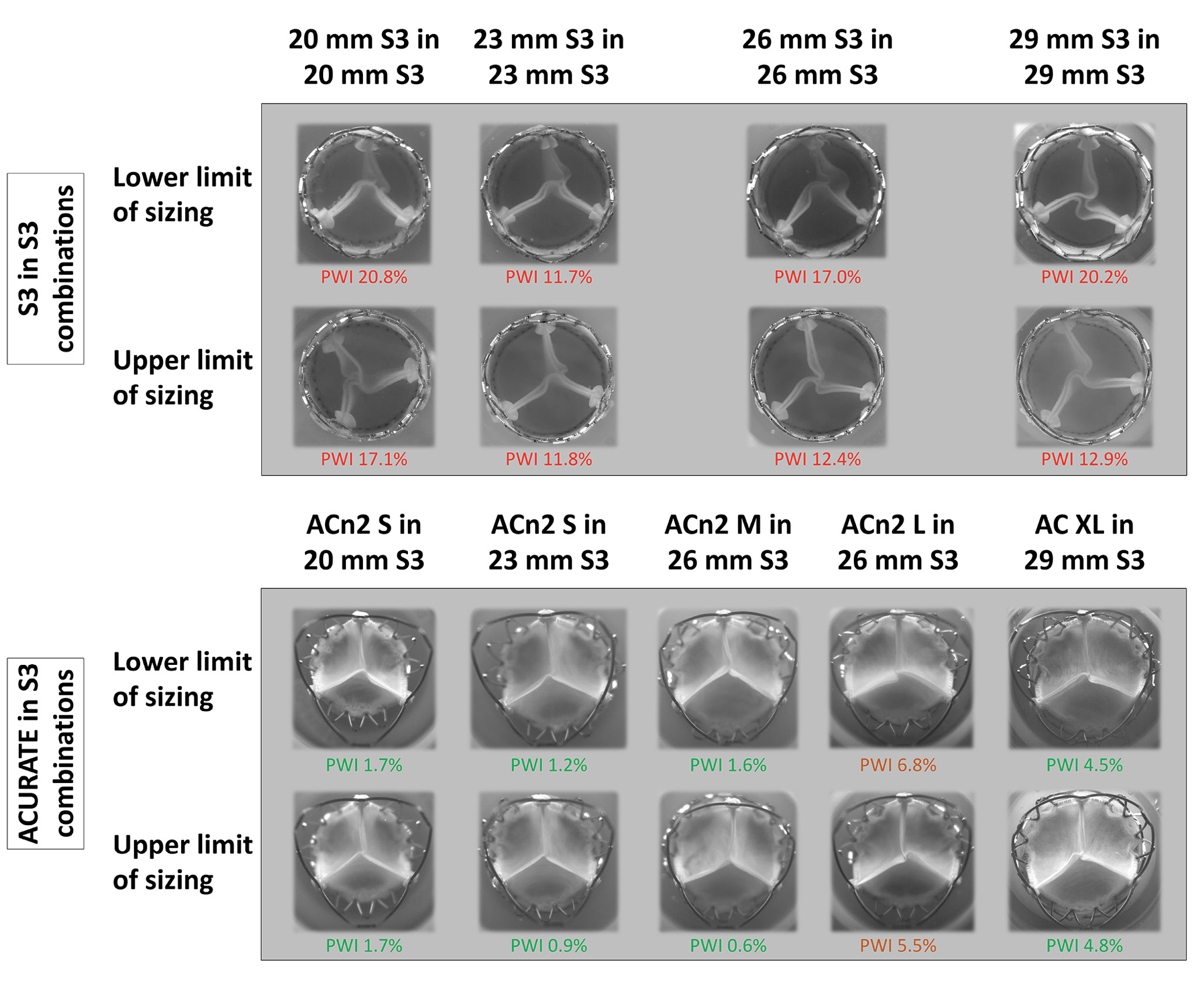 METHODS: Redo-TAVI was performed on the bench using each available size of the S3, the ACURATE neo2 (ACn2) and the next-generation ACURATE Prime XL (AC XL) implanted at 2 different depths within 20 mm/23 mm/26 mm/29 mm S3s serving as the “failed” index THV. Hydrodynamic testing was performed to assess THV function. Multimodality assessment was performed using photography, X-ray, microcomputed tomography (micro-CT), and high-speed videos.