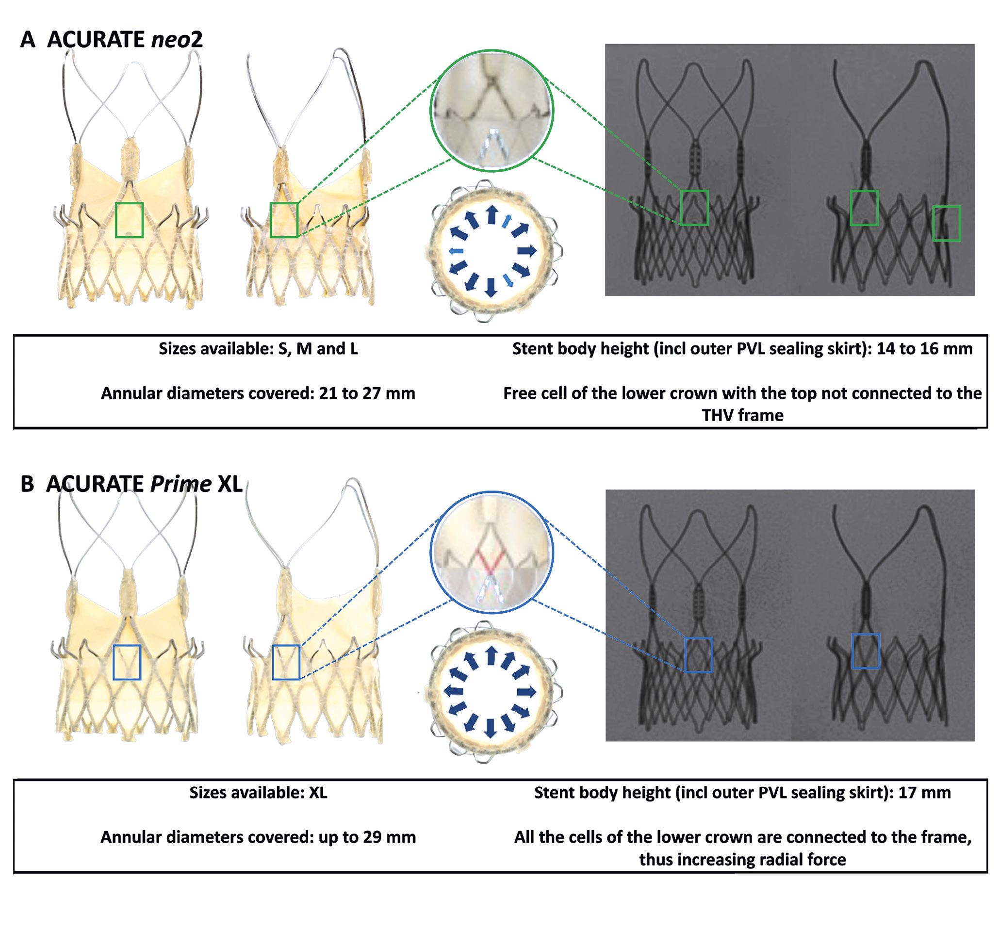 Figure 2. Features of the ACURATE neo2 and ACURATE Prime XL devices. A) ACURATE neo2; B) ACURATE Prime XL. incl: including; M: medium; L: large; PVL: paravalvular leak; S: small; THV: transcatheter heart valve