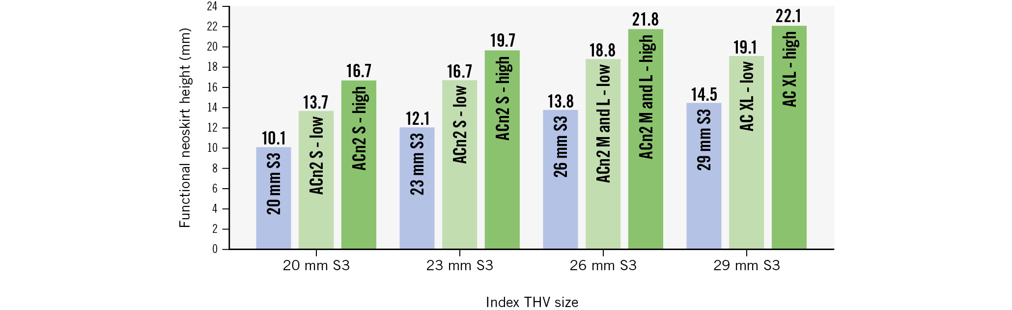 Figure 5. Graphical illustration of functional neoskirt height according to THV type and size. ACn2 S: ACURATE neo2 small; ACn2 M: ACURATE neo2 medium; ACn2 L: ACURATE neo2 large; AC XL: ACURATE Prime XL; S3: SAPIEN 3; THV: transcatheter heart valve