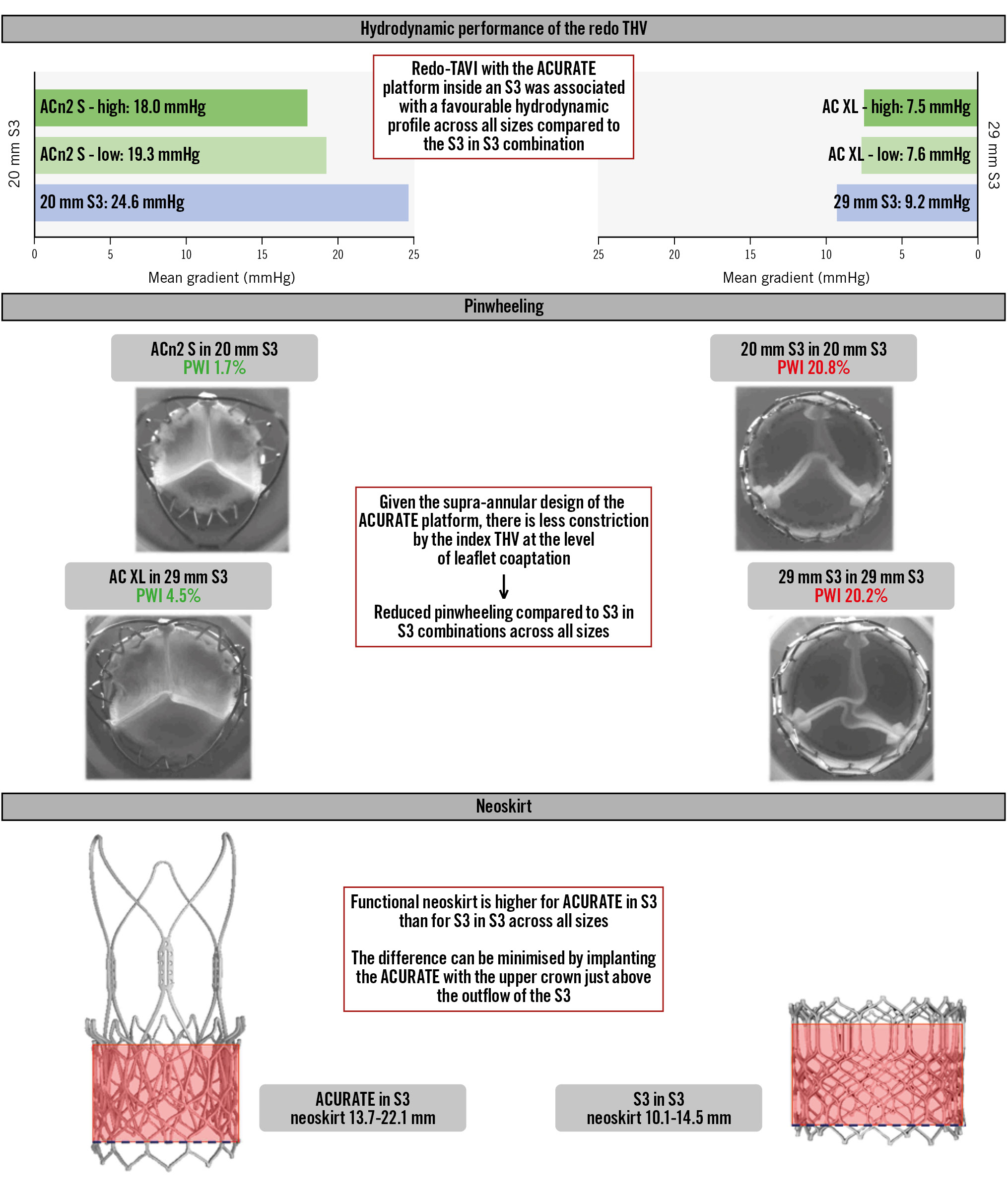 RESULTS: The ACURATE in S3 combinations had favourable hydrodynamic performance compared to the S3 in S3 for all size combinations. In the 20 mm S3, redo-TAVI with the ACn2 had lower gradients compared to the S3 (mean gradient 16.3 mmHg for the ACn2 vs 24.7 mmHg for the 20 mm S3 in 20 mm S3). Pinwheeling was less marked for the ACURATE THVs than for the S3s. On micro-CT, the S3s used for redo-TAVI were underexpanded across all sizes. This was also observed for the ACURATE platform, but to a lesser extent.
