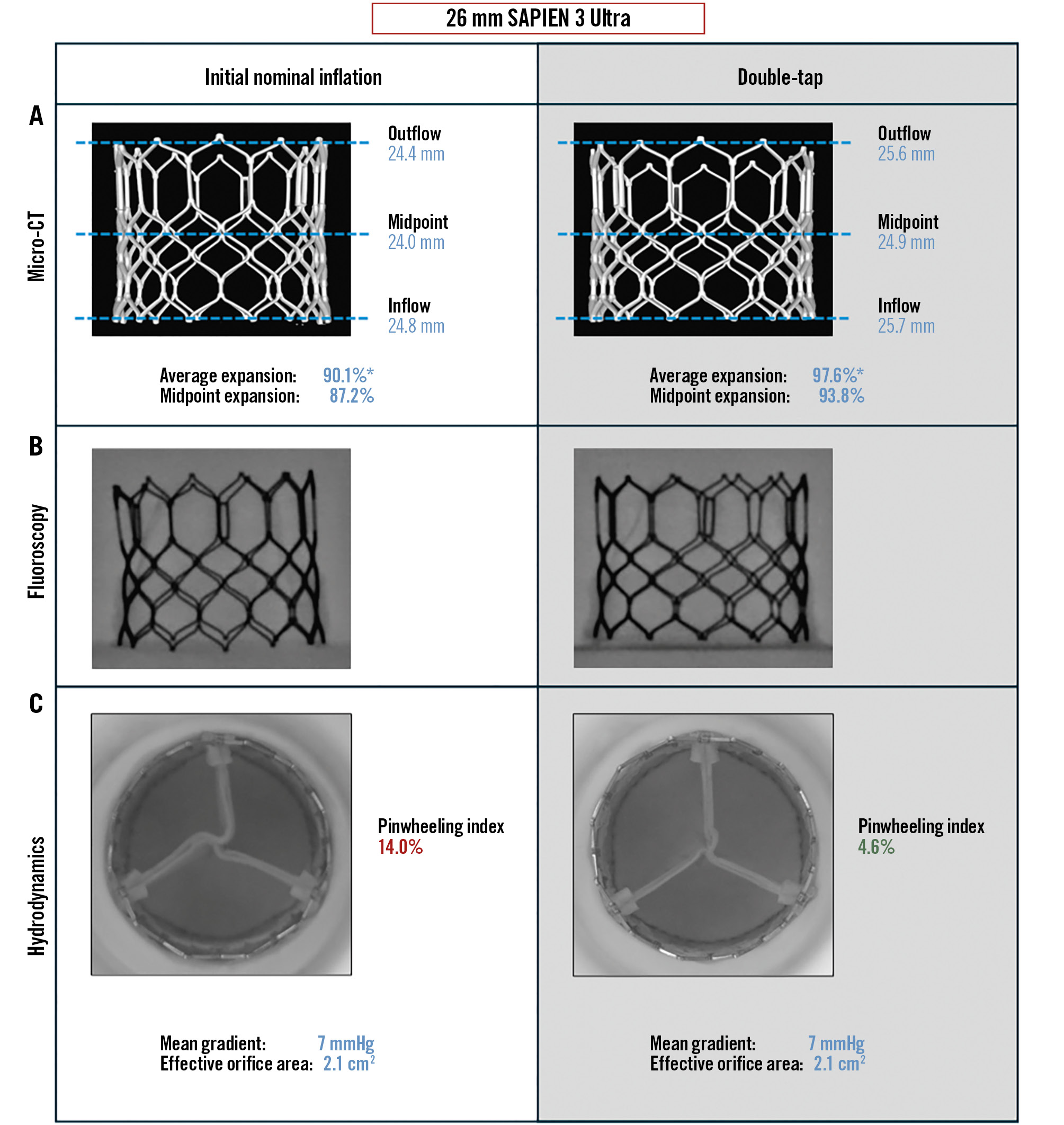 Transcatheter aortic valve implantation (TAVI) has become the favoured treatment strategy for most patients with severe aortic stenosis (AS)1. An increase in TAVI utilisation in younger patients with potential for longevity creates a greater need for optimised transcatheter heart valve (THV) function and durability. THV underexpansion following balloon-expandable (BE) TAVI is common2 and has been linked to impaired THV function and durability due to suboptimal leaflet coaptation, pinwheeling, high leaflet stress, alteration in blood flow, hypoattenuated leaflet thickening (HALT), and thrombus2345. Post-dilatation of underexpanded BE THVs can improve expansion, increase the effective orifice area (EOA), decrease the risk of patient-prosthesis mismatch, and reduce paravalvular leak (PVL)6789. Post-dilatation has typically been performed by overfilling the delivery system balloon, using a less compliant balloon, or by using a larger balloon, with a possible increased risk of stroke or annular injury678. The double-tap technique refers to post-dilatation by reusing the delivery system balloon at the same volume10. While ad hoc double-tap has become common in many centres, there has been no systematic evaluation of the safety and efficacy of its routine use. We hypothesised that routine double-tap would improve THV expansion without increasing the risk of adverse procedural events. The present study reports a proof of concept of double-tap on the bench as well as the results of a clinical cohort in which this technique was used routinely after BE TAVI.