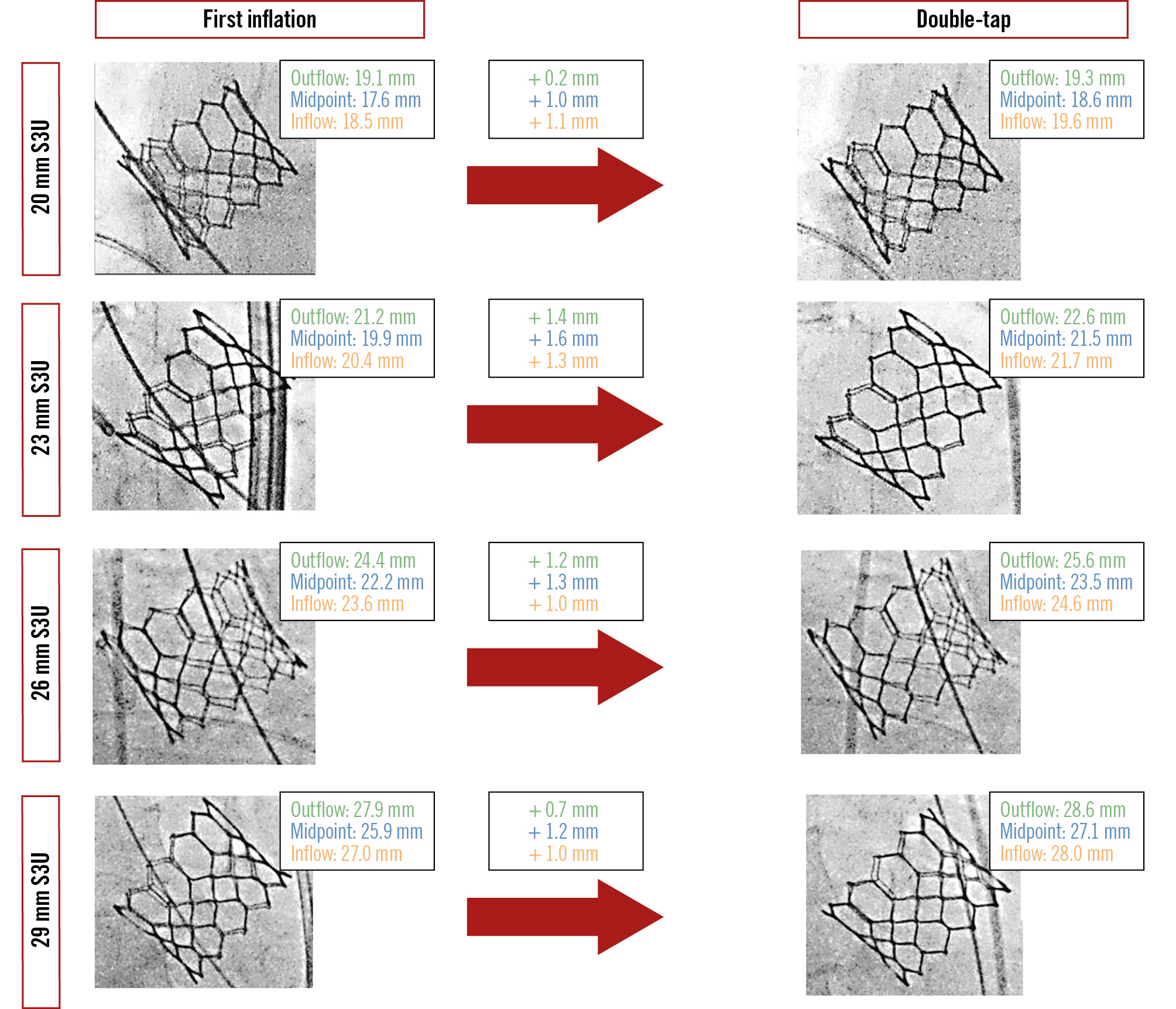 Results: Routine double-tap was performed in 102 patients. Despite nominal deployment, all patients had some degree of THV underexpansion after the first inflation. Fluoroscopic analysis documented an increase in minimal THV expansion by cross-sectional area of 9.8% for the 20 mm S3U (p=0.151), 9.9% for the 23 mm S3U (p<0.001), 9.2% for the 26 mm S3U (p<0.001), and 8.6% for the 29 mm S3U (p=0.002). There was no stroke or cardiovascular mortality at 30 days.