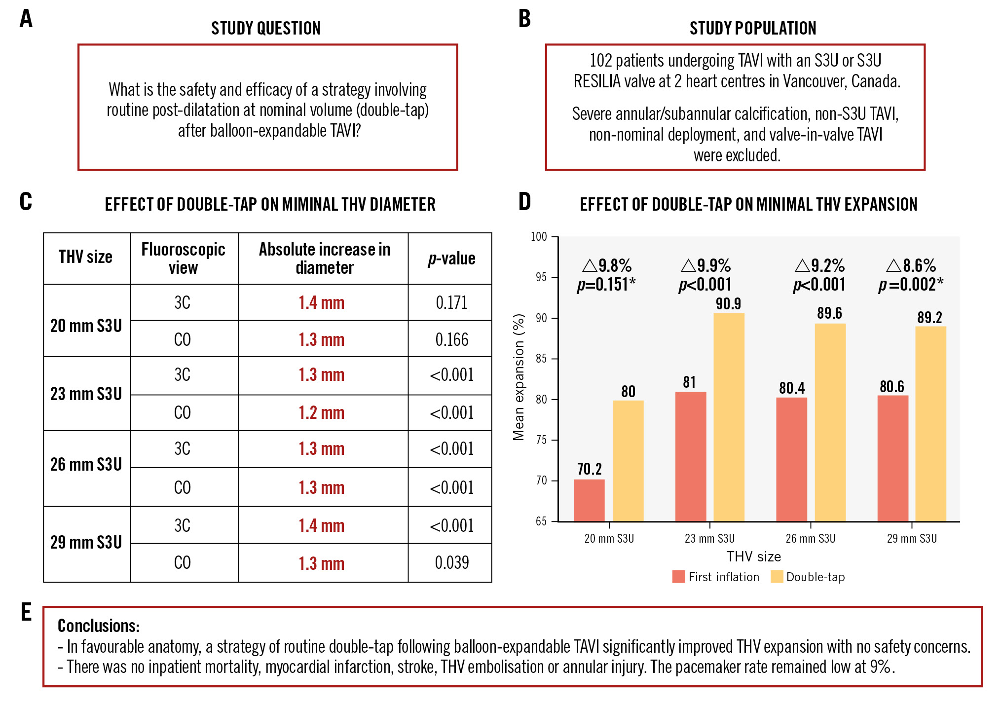 Central illustration. Routine post-dilatation at nominal volume after balloon-expandable TAVI. A) Study question. B) Study population. Effects of double-tap on minimal THV diameter (C) and expansion (D). E) Study conclusions. *small (<10 patients) subgroup. 3C: three-cusp; CO: cusp-overlap; S3U: SAPIEN 3 Ultra; TAVI: transcatheter aortic valve implantation; THV: transcatheter heart valve