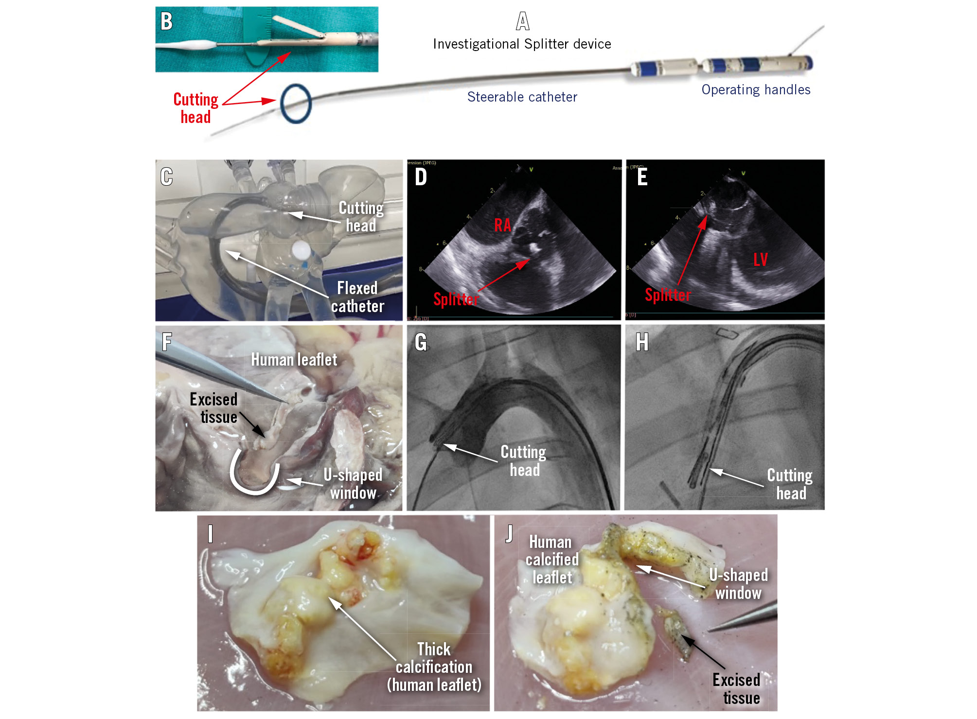 Figure 1. The Splitter system. A) An image of the Splitter system. B) A close-up image of the Splitter's cutting head. C) The Splitter inside a human heart silicone model, showing how the cutting head reaches the valve. D) The Splitter's cutting head as demonstrated by ICE during a porcine study (short-axis view). E) The Splitter's cutting head echo image during a porcine study (long-axis view). F) Precise excision of leaflet tissue and creation of a large U-shaped window in the cusp, demonstrated during an ex vivo test on human heart tissue. G) The Splitter's cutting head placed on the right coronary cusp as demonstrated by fluoroscopy imaging during a porcine study. H) Fluoroscopy image of the cutting head grasping a pigtail next to the right coronary cusp during a porcine study. I) Explanted human calcified leaflet (native). J) The same human calcified leaflet after cutting with the Splitter; the U-shaped window and the excised tissue are clearly observed. ICE: intracardiac echocardiography; LV: left ventricle; RA: right atrium