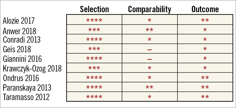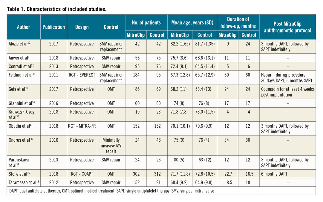 Systematic reviews support the long-term safety of transcatheter mitral valve repair (TMVR) with the MitraClip for degenerative and functional MR plus the durability of MR reduction12,13. Recent meta-analyses have demonstrated that, compared with conservative treatment alone, TMVR is associated with a significant relative risk reduction of death from any cause and heart failure in high-risk patients with left ventricular dysfunction14,15. However, none of these reviews specifically analysed stroke incidence. In 2018, the COAPT trial16 reinforced the increased safety of the edge-to-edge repair technique compared to optimal medical treatment (OMT), while the MITRA-FR trial17 reported no significant difference in adverse effects between the two groups.