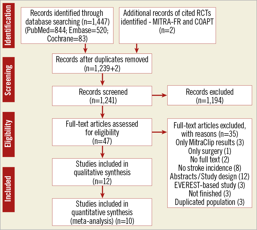 The literature search identified 1,447 articles. Two cited RCTs (MITRA-FR and COAPT) were added. After duplication removal, we excluded a total of 1,194 publications based on title and abstract evaluation, study type (RCTs or observational studies comparing the MitraClip procedure with SMVR and/or OMT) and study population (participants with severe MR). The full text of the remaining 47 studies was then screened, leading to the exclusion of 35 publications: three studies only included outcomes of MitraClip populations, one study only reported stroke rates on the mitral valve surgical arm, two full texts could not be accessed, eight did not specifically refer to post-procedure stroke incidence, 12 were conference abstracts or RCT design studies, three used data from the EVEREST trial for a different analysis and three RCTs did not yet include any published results; the study by Taramasso et al was chosen among four studies based on the same institutional population, as it included a wider number of participants18,19,20,21. Finally, 12 publications met all the inclusion criteria for the qualitative review; 10 of these were suitable for the quantitative synthesis with meta-analysis (Figure 3). Seven studies compared TMVR versus SMVR and three TMVR versus OMT, providing a total of 1,881 patients and 61 pooled strokes (16 in TMVR versus SMVR and 45 in TMVR versus OMT). Baseline characteristics of the included studies are shown in Table 1.