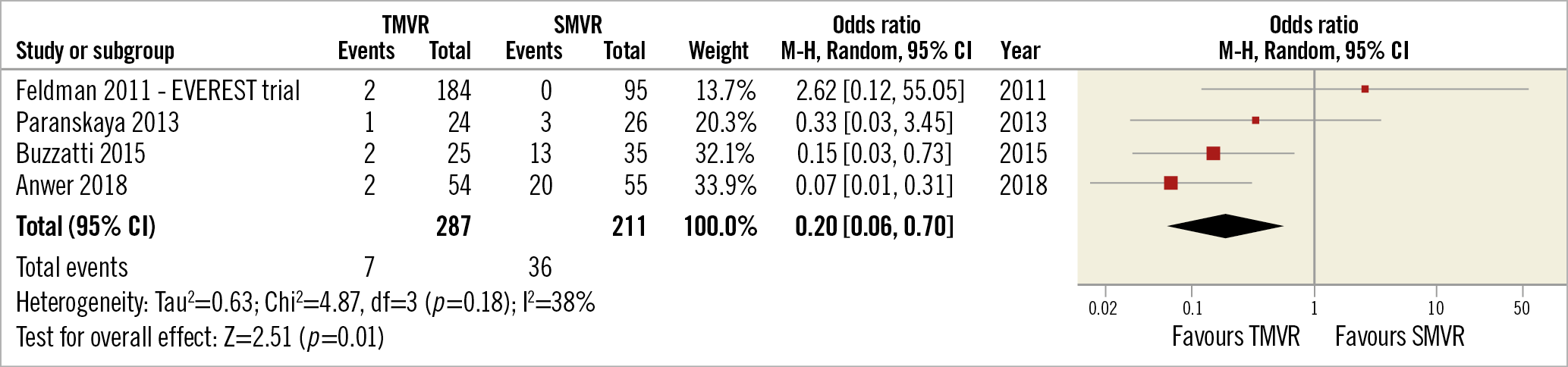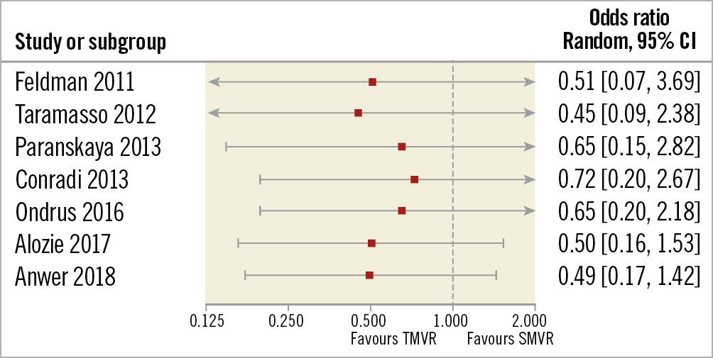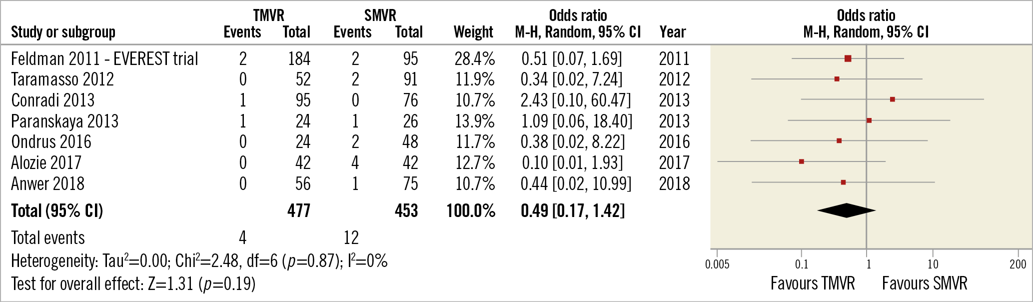 The most important limitation of our meta-analysis is the paucity of RCTs on this issue. In fact, the majority of studies included were observational and not randomised, increasing the risk of bias and therefore limiting the strength of our results. Furthermore, for our primary outcome there were only 16 events among the 930 patients included in the comparison between TMVR and SMVR, which may have single-handedly reduced the odds of unveiling a significant difference in stroke rates. We tried to overcome this limitation by applying a continuity correction and a cumulative meta-analysis28. One could argue that the low event rate is the justification for the statistical homogeneity found (I2=0%), despite numerical heterogeneity (odds ratios ranging from 0.1 to 2.43), that enabled the performance of a cumulative meta-analysis. However, by combining study events and sample sizes, cumulative meta-analysis may improve the statistical power as similar results are combined cumulatively. This method reduces the problem caused by the low event rate and especially by the presence of zero values in study groups. Regarding pooled stroke, data were not available for fatal versus non-fatal stroke, haemorragic stroke or transient ischaemic attack.