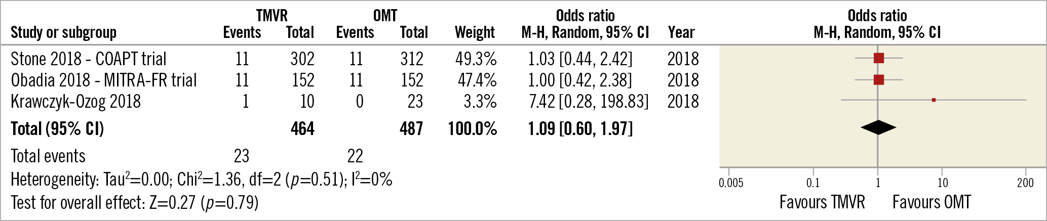 There were five studies comparing TMVR using the MitraClip plus OMT with OMT alone. However, only three of these provided data on stroke incidence during follow-up in both the TMVR and OMT groups and these were used for meta-analysis. No difference in stroke rate was identified (pooled OR 1.09 [0.60, 1.97], p=0.79, I²=0%) (Figure 9).