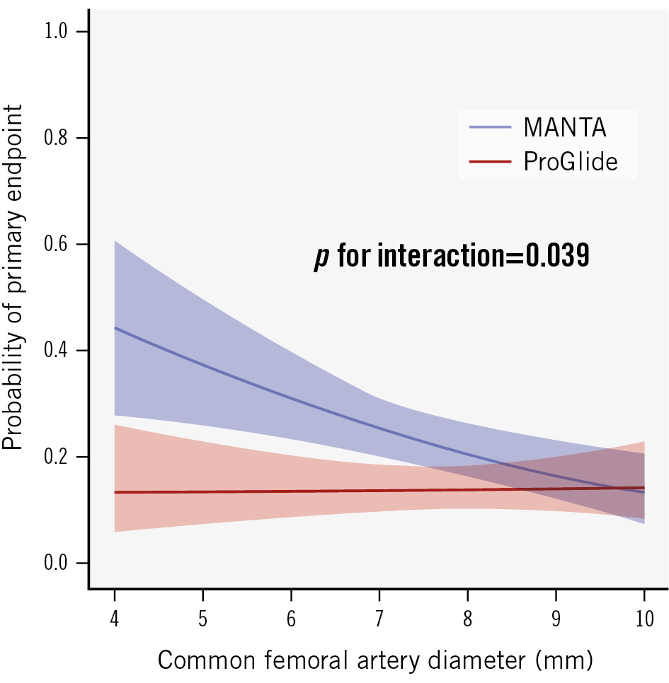 Nearly all prespecified subgroups, with respect to the primary endpoint, consistently suggested a benefit of the ProGlide-based technique, without a statistically significant interaction (Figure 2). Since only a few patients had a high femoral bifurcation above the femoral head, it is difficult to draw any conclusions about this subgroup. Analysis of continuous variables revealed a steady decline of the probability of the primary endpoint for the MANTA-based technique in larger femoral arteries (Figure 3). A femoral artery diameter >9.5 mm was associated with a trend towards fewer major and minor access site-related vascular complications with the MANTA-based technique than with the ProGlide-based technique. All other interactions of continuous variables were in favour of the ProGlide-based technique (Supplementary Figure 1, Supplementary Figure 2). The primary endpoint and the individual endpoint of access site-related minor vascular complications was significantly more common in the CHOICE-CLOSURE trial (Supplementary Table 10). Furthermore, we analysed the non-prespecified subgroups of compression duration and the additional use of a small plug-based VCD in the ProGlide cohort. We categorised the compression duration into three groups: less than 3 minutes, 3-10 minutes, and more than 10 minutes. A longer compression duration was associated with a higher likelihood of the primary endpoint (OR 3.55, 95% CI: 1.29-9.77). However, the used VCD did not significantly modify the effect of compression duration on the primary endpoint (OR 0.79, 95% CI: 0.39-1.64; p for interaction=0.53) (Supplementary Figure 3). The combination of two ProGlide VCDs with a small plug-based VCD demonstrated a significant reduction of the primary endpoint compared to the MANTA-based technique (OR 0.46, 95% CI: 0.26-0.82), whereas the pure ProGlide-based technique showed no significant difference compared to the MANTA-based technique (OR 0.61, 95% CI: 0.37-1.03). The results of the different statistical models for the prespecified primary and secondary endpoints, as well as measurements for heterogeneity (I² and Tau) and model diagnostic parameters are summarised in Supplementary Table 11. There were no relevant outcome differences between the statistical models. Furthermore, the heterogeneity in the other statistical models was generally low.