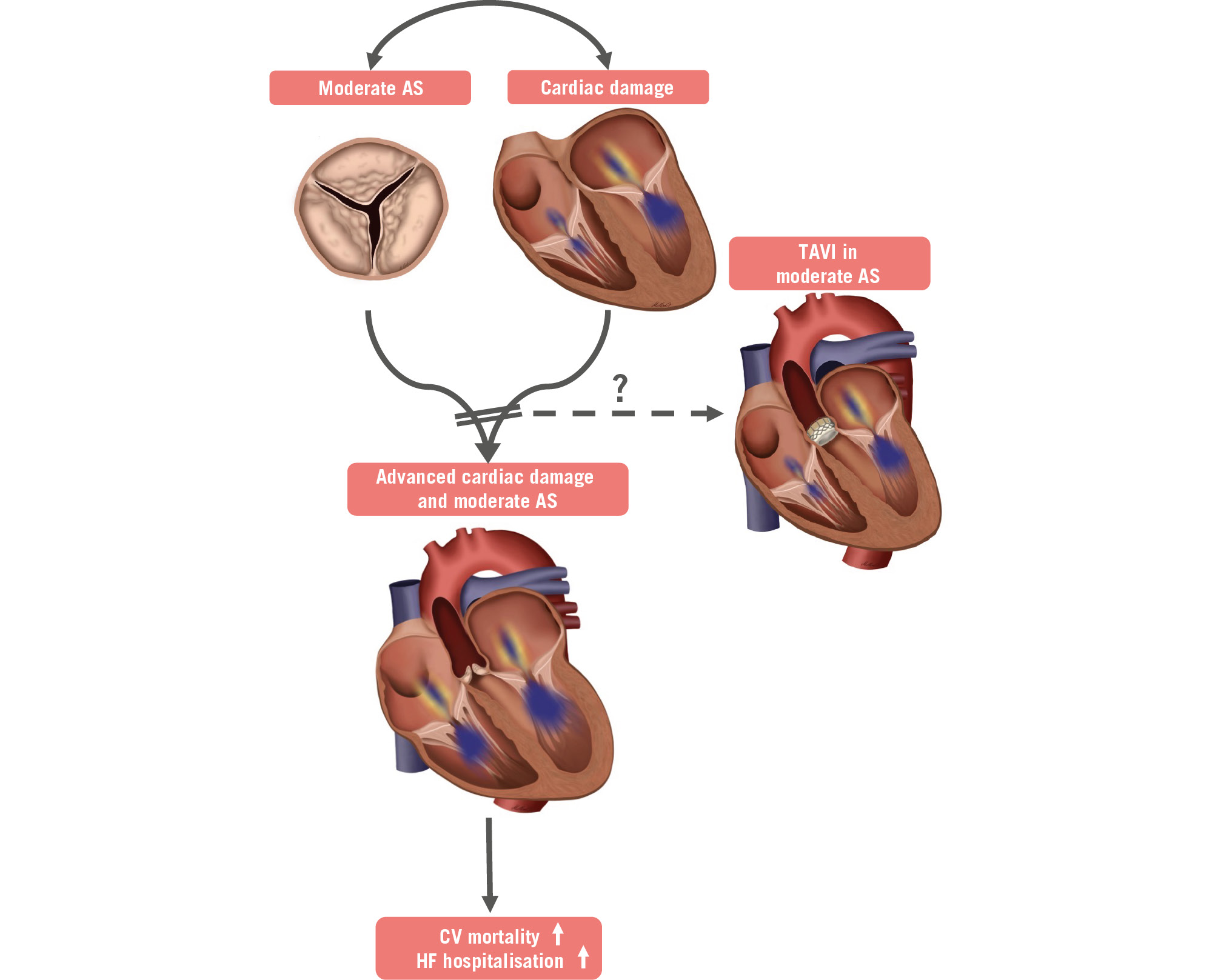 Figure 1. The potential benefit of TAVI in patients with moderate AS and cardiac damage. AS: aortic stenosis; CV: cardiovascular; HF: heart failure; TAVI: transcatheter aortic valve implantation