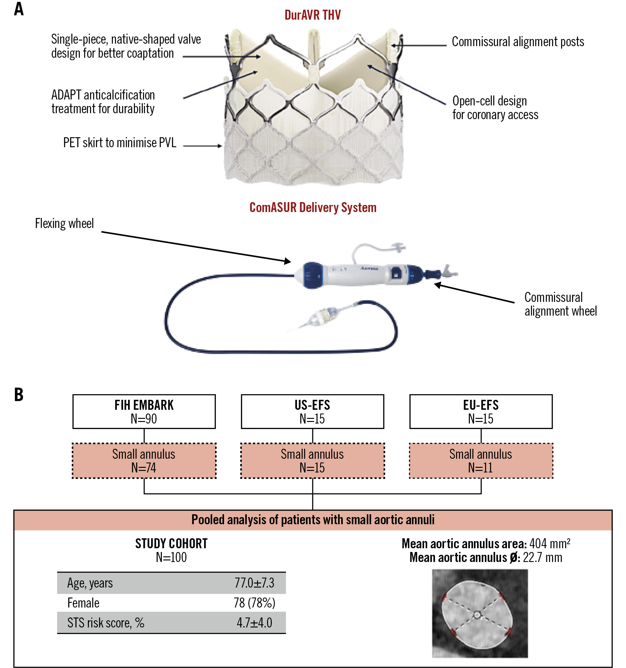 Figure 1. DurAVR THV and study cohort. A) The DurAVR transcatheter heart valve (THV) is a short-frame, balloon-expandable valve featuring a novel single-leaflet, native-shaped biomimetic leaflet design that replicates native aortic valve leaflets. The valve is delivered using the dedicated ComASUR Delivery System, which permits active patient-specific commissural alignment. B) The study cohort comprises all patients with a small aortic annulus treated in the first-in-human and early feasibility studies. EFS: early feasibility study; EU: European; FIH: first-in-human; PET: polyethylene terephthalate; PVL: paravalvular leak; STS: Society of Thoracic Surgeons