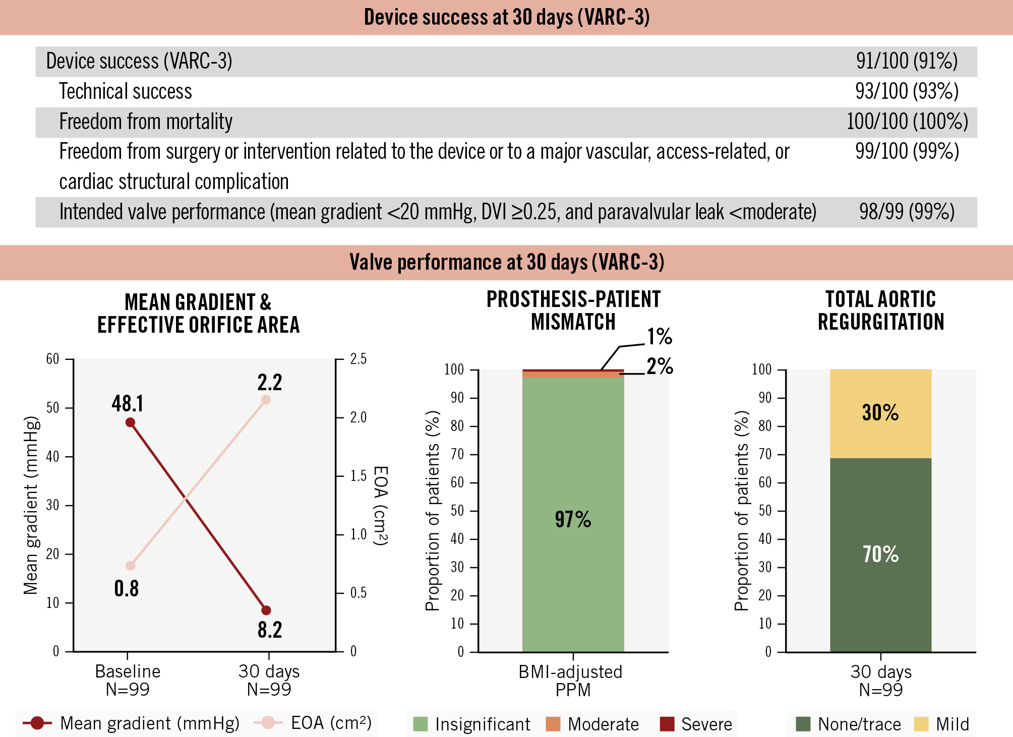 Figure 3. Thirty-day device success and valve performance. The DurAVR THV demonstrated high device success and favourable haemodynamic outcomes at 30 days post-procedure in patients with small aortic annuli. BMI: body mass index; DVI: Doppler velocity index; EOA: effective orifice area; PPM: prosthesis-patient mismatch; THV: transcatheter heart valve; VARC: Valve Academic Research Consortium