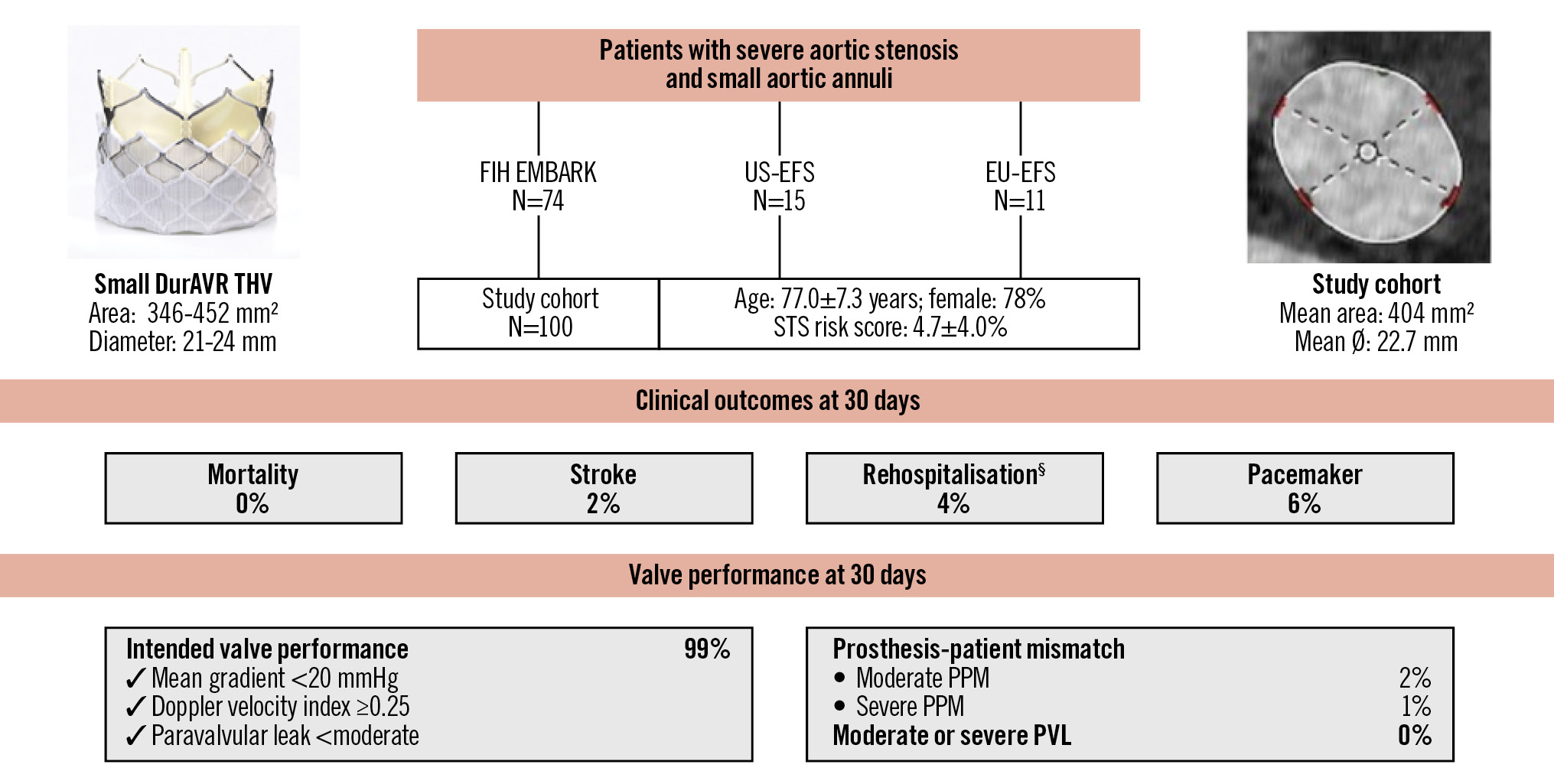 Central illustration. Outcomes of the biomimetic balloon-expandable DurAVR THV in small aortic annuli. VARC-3-defined clinical outcomes and valve performance at 30 days after DurAVR THV implantation in a patient population with small aortic annuli. §Procedure- and valve-related hospitalisations. PPM: prosthesis-patient mismatch; STS: Society of Thoracic Surgeons; THV: transcatheter heart valve; VARC: Valve Academic Research Consortium
