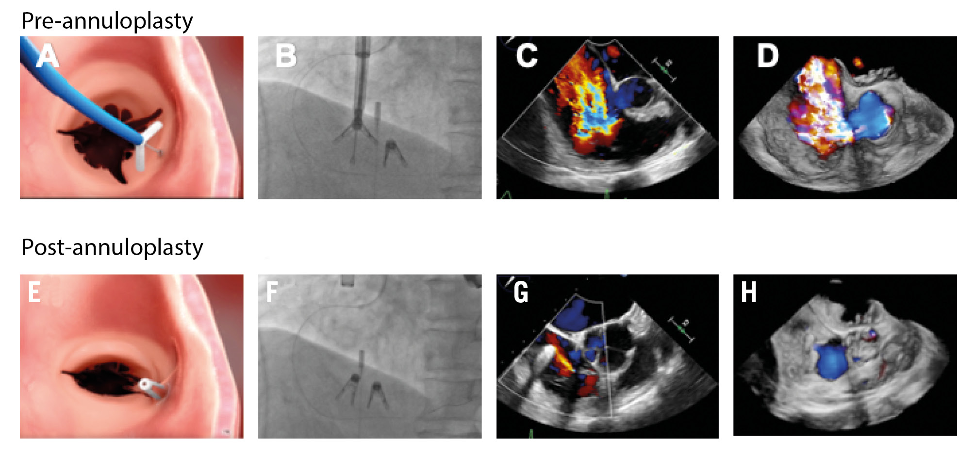 Figure 1. Pre- and post-annuloplasty images of the K-Clip tricuspid system. A,E) Tricuspid annulus capture, (B,F) fluoroscopy, (C,G) 2-dimensional TOE, and (D,H) 3-dimensional TOE en face. TOE: transoesophageal echocardiography