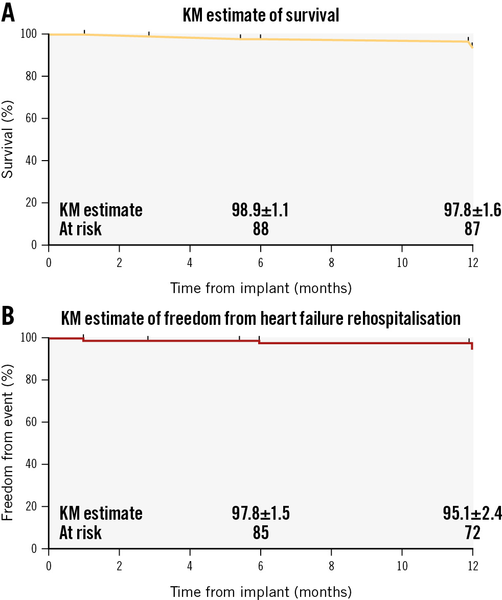 The incidence of MAE at different follow-up timepoints is summarised in Table 3. The composite MAE rate was 6.3% at 30 days and 13.2% at 1 year. At 1 year, there were 5 deaths in implanted patients, all of which were adjudicated as unrelated to the study procedure by the clinical events committee (one due to septic shock, one due to severe pneumonia with major gastrorrhagia, one due to cerebral haemorrhage followed by multiple organ failure and two due to fatal gastrointestinal haemorrhage). There were no incidences of cardiovascular mortality, need for TV reintervention, stroke, embolism or renal complication requiring unplanned dialysis throughout the study period. Requirement of a new permanent pacemaker implantation was recorded in 3 patients due to AF/Af and sick sinus syndrome, all of which occurred after 30 days post-implantation. Severe bleeding events were reported in another patient with extensive retroperitoneal haematoma before discharge who needed a blood transfusion. Overall, the Kaplan-Meier estimates for survival and freedom from heart failure hospitalisation were 97.8% and 95.1%, respectively (Figure 2A-Figure 2B).
