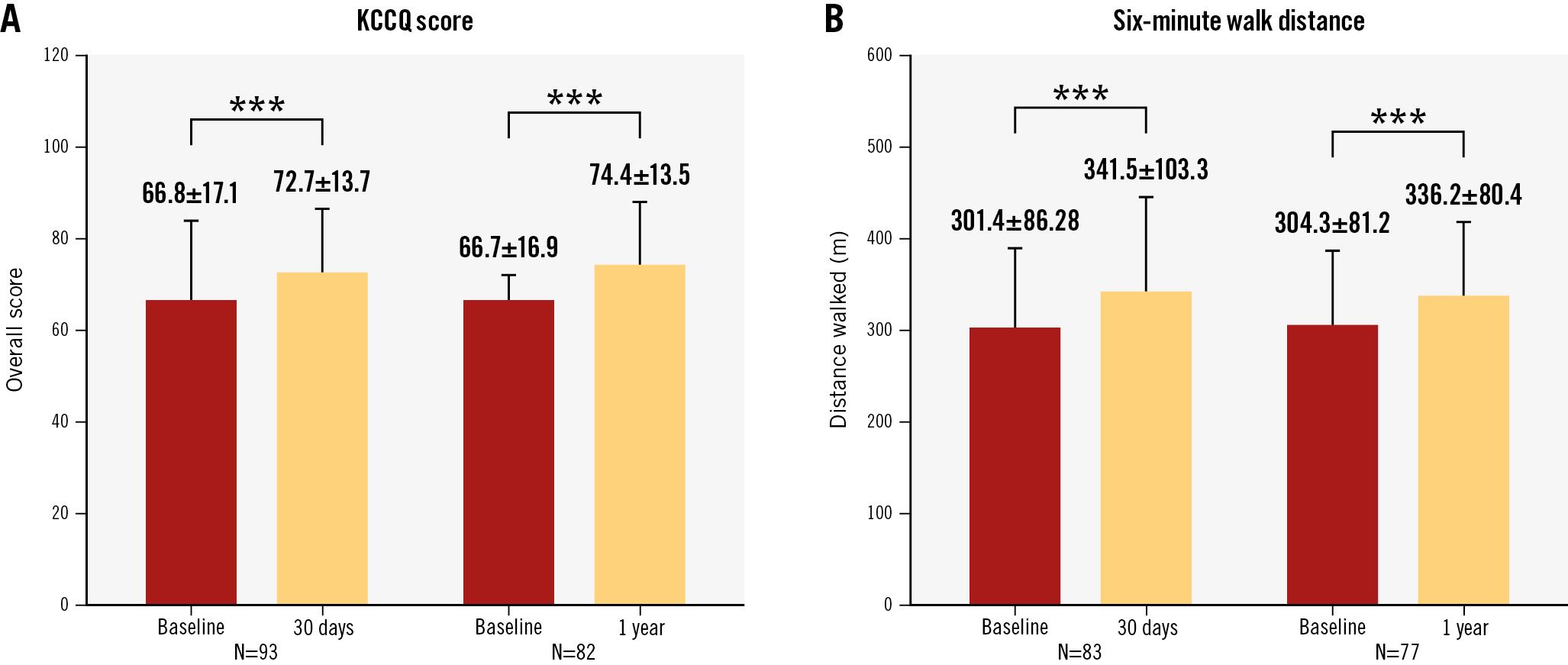 Significant improvements in functional status, exercise capacity, and quality-of-life outcomes were observed between baseline and 1 year. Paired analysis showed that rates of patients assessed as NYHA Class I-II increased from 32.6% at baseline to 96.5% at 1-year follow-up (p<0.001) (Central illustration). The KCCQ score improved from 66.7±16.9 points to 74.4±13.5 points, reflecting a mean improvement of 7.6±17.7 points (p<0.001) (Figure 3A), while the mean 6MWD increased by 31.9±71.8 m from 304.3±81.2 m at baseline to 336.2±80.4 m at 1 year (p<0.001) (Figure 3B). At 1 year, 69.8% (60/86) of the patients required a lower dose of diuretics than at baseline, indicating less reliance on diuretic therapy in our study population. A significant improvement was observed in serum albumin level (40.8±5.0 g/L vs 44.1±2.8 g/L), while other biochemical variables including ALT, eGFR and NT-proBNP all trended towards improvement (Supplementary Table 1).