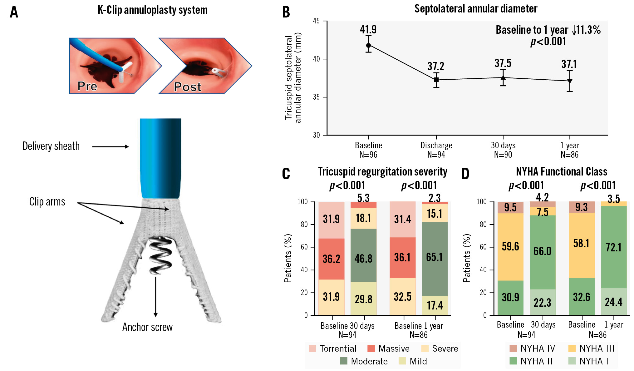 Central illustration. One-year outcomes of patients treated with the transcatheter K-Clip annuloplasty system for severe secondary tricuspid regurgitation. A) The K-Clip annuloplasty system contains two clip arms and one anchor screw to form a “clamp-annulus-screw sandwich structure” for tricuspid valve annuloplasty. B) End-diastolic septolateral diameters at baseline, discharge, 30 days and 1 year. Values are mean, with 95% confidence intervals. C) Paired analysis of core laboratory-adjudicated TR severity at baseline and during 30-day and 1-year follow-ups. D) Paired analysis of NYHA Functional Class at baseline and during 30-day and 1-year follow-ups. NYHA: New York Heart Association; TR: tricuspid regurgitation