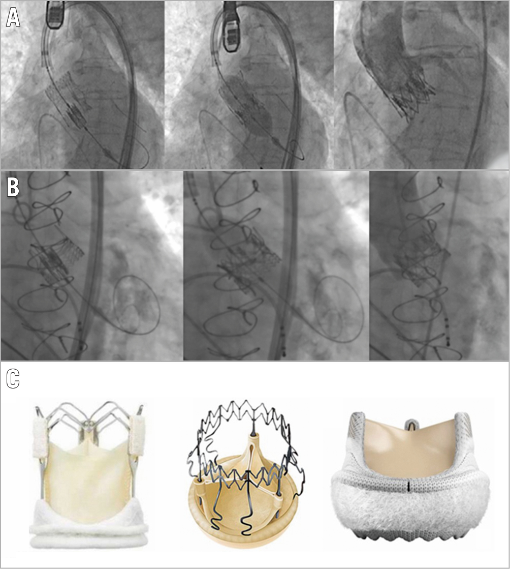 Figure 1. Transcatheter aortic valve implantation into (A) Perceval and (B) INTUITY sutureless surgical heart valves. (C) Left: ATS 3f Enable (Medtronic); middle: Perceval (Sorin Biomedica); right: INTUITY (Edwards Lifesciences).