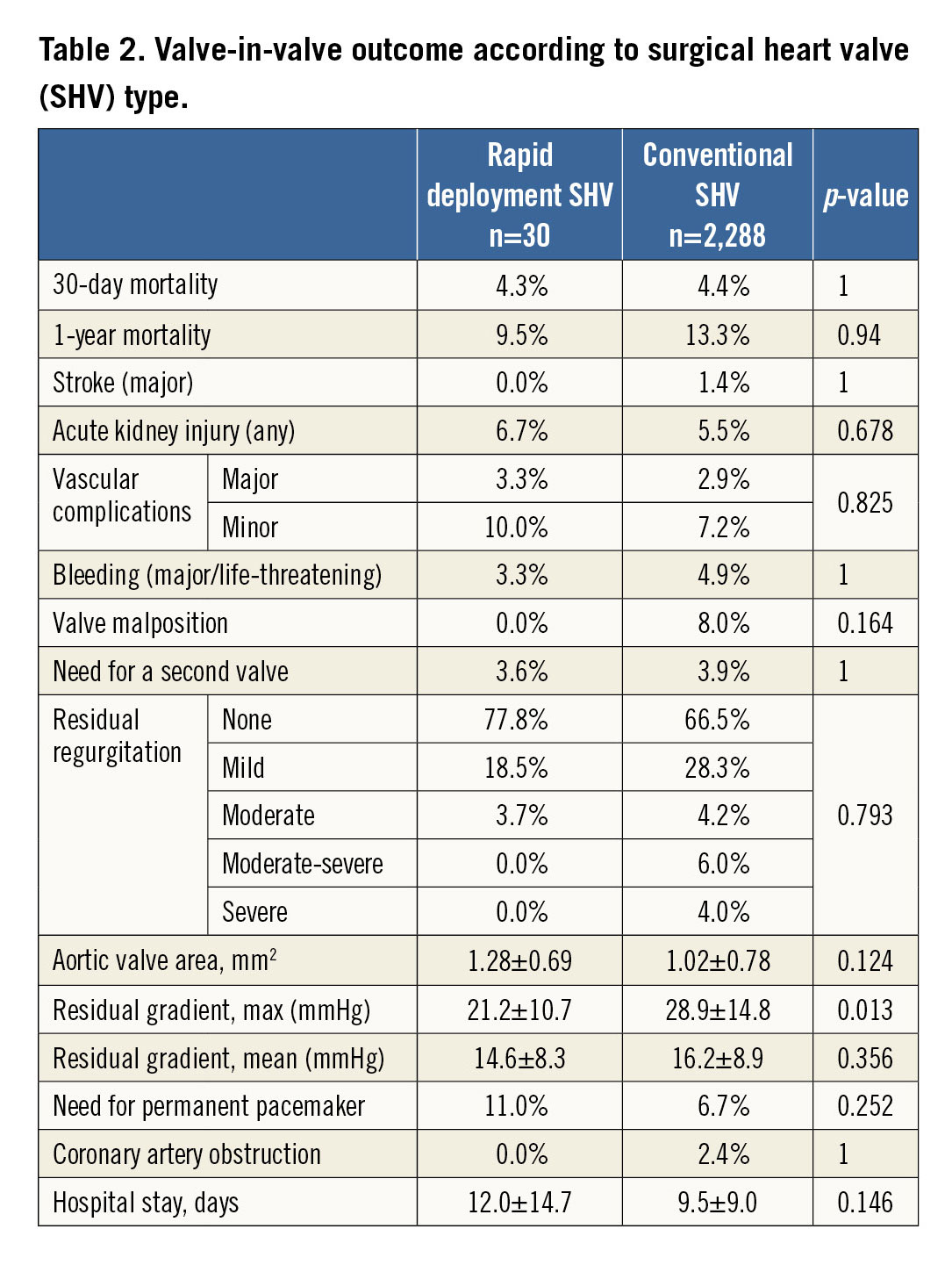 Transcatheter valve-in-valve implantation (ViV) is used to treat failed surgical aortic valve bioprostheses but was only anecdotally described in rapid deployment surgical valves (SHVr), which are increasingly being used. Compared to conventional ViV (ViVc), ViVr patients presented twice as early after surgery, and more commonly with aortic regurgitation. Implantation was successful in all ViVr cases and associated with favourable haemodynamic outcome, low periprocedural complications (including coronary obstruction) and a low one-year mortality rate. Although further evaluation with longer follow-up and larger cohorts is needed to assess ViVr fully, ViV might be a valid treatment option in selected patients with failed SHVr.