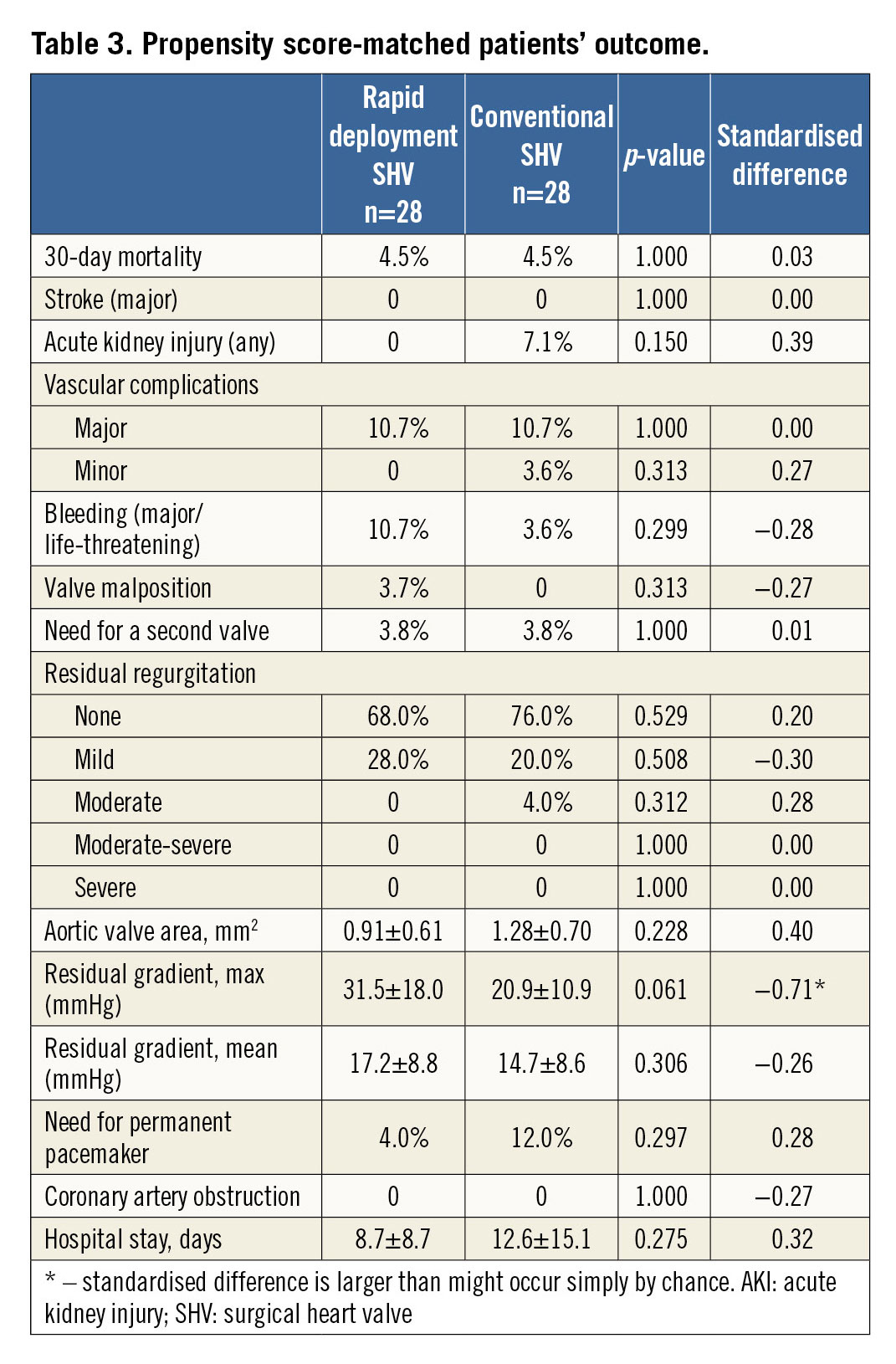 Using propensity score matching across imputation, 56 patients (28 pairs) were found eligible for 1:1 ViVr to ViVc matching. Baseline covariates and procedural characteristics were evenly distributed across the groups, including patients’ sex, body stature and body weight, yet excluding surgical AVR to ViV time interval (65.3±30.9 months ViVr vs. 126.4±69.9 months ViVc, p=0.001) (Supplementary Table 2). Thirty days after the procedure, aortic valve area was 1.28±0.70 vs. 0.91±0.61 cm2 (p=0.228), maximal residual transvalvular gradient was 20.9±10.9 vs. 31.5±18.0 mmHg (p=0.061) and mean residual gradient was 14.7±8.6 vs. 17.2±8.8 mmHg (p=0.306) in ViVr vs. ViVc, respectively. No significant difference was observed between the groups in terms of clinical outcomes, including 30-day mortality, cerebrovascular events, vascular complications, acute kidney injury or need for permanent pacemaker (Table 3).