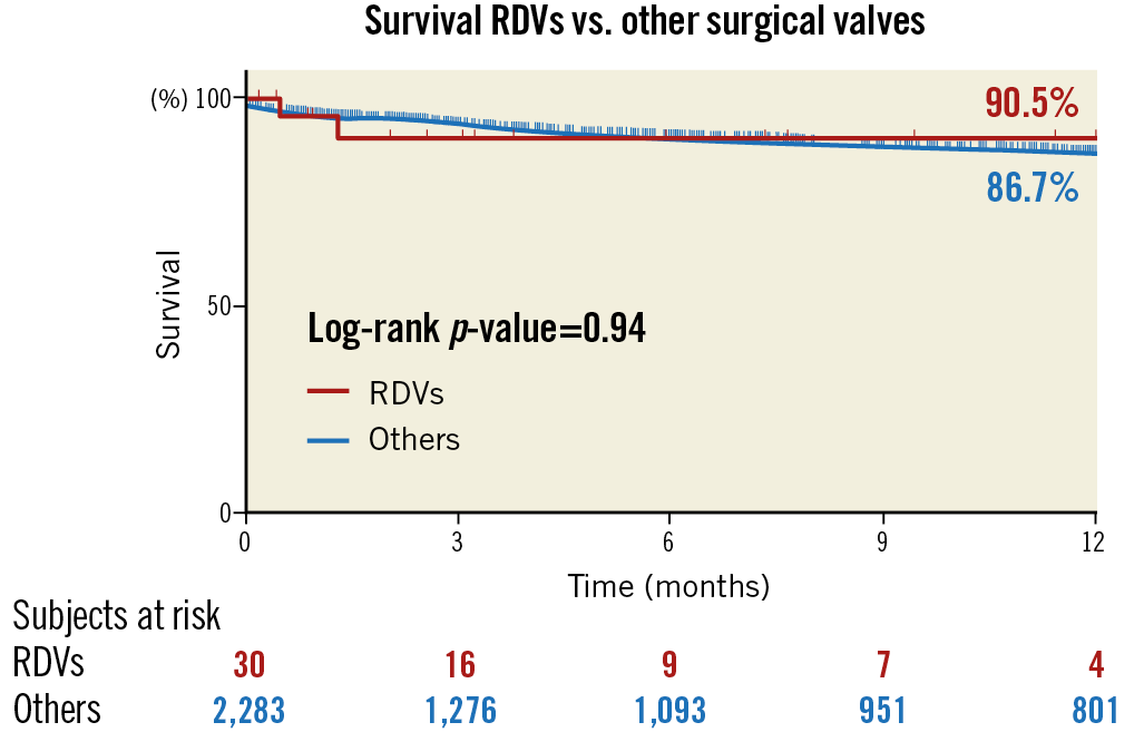 Figure 2. Kaplan-Meier survival curve after transcatheter aortic valve implantation into a failed surgical heart valve bioprosthesis (valve-in-valve) in respect of SHV type. RDVs: rapid deployment valves