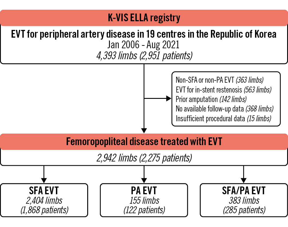 The study population was subsequently divided into three distinct groups based on the extent of EVT in the target limbs: (1) EVT for the SFA (SFA group: 2,404 limbs [1,868 patients]), (2) EVT for the PA (PA group: 155 limbs [122 patients]), and (3) EVT for both SFA and PA (SFA/PA group: 383 limbs [285 patients]). The study protocol received approval from the institutional review board at each participating centre and was executed in compliance with the principles outlined in the Declaration of Helsinki. Informed consent was obtained from all patients, except those whose data were collected retrospectively.
