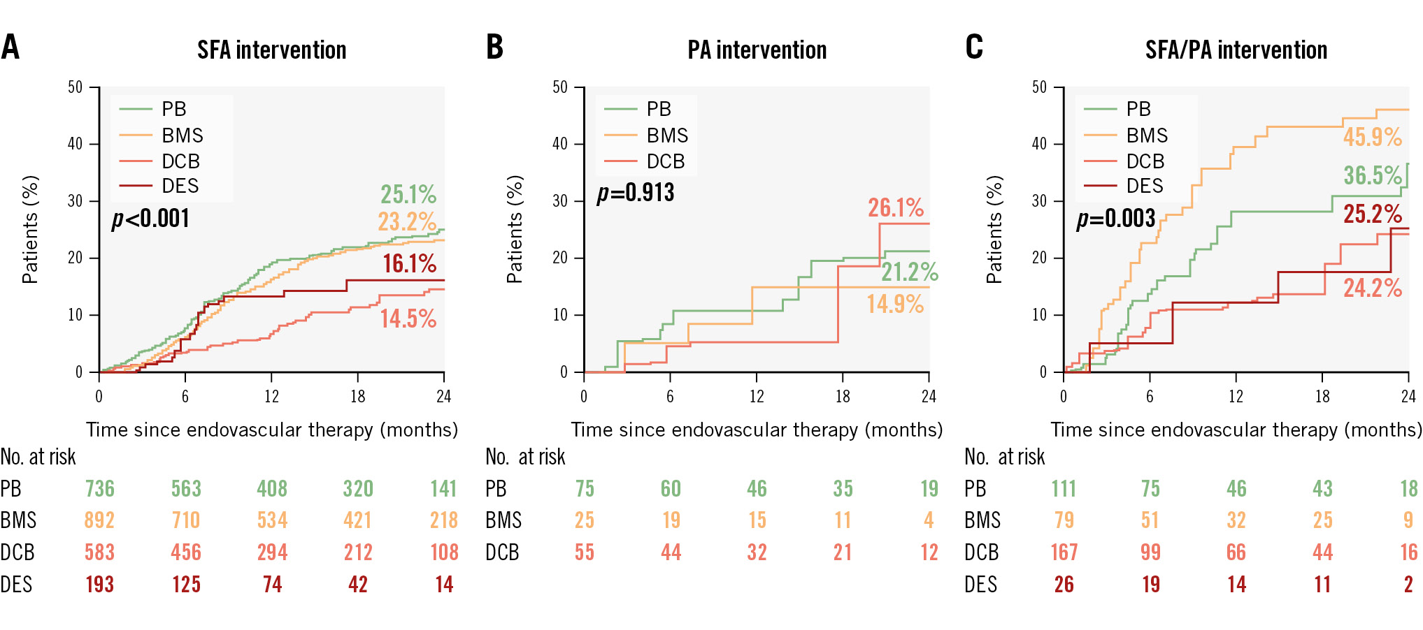 Figure 2. *Analysis based on patient-level data. Kaplan-Meier curves of target lesion revascularisation using overlap weighting between final treatment device groups, stratified by femoropopliteal treatment extent. The curves represent SFA intervention (A), PA intervention (B), and combined SFA/PA intervention (C). BMS: bare metal stent; DCB: drug-coated balloon; DES: drug-eluting stent; PA: popliteal artery; PB: plain balloon; SFA: superficial femoral artery