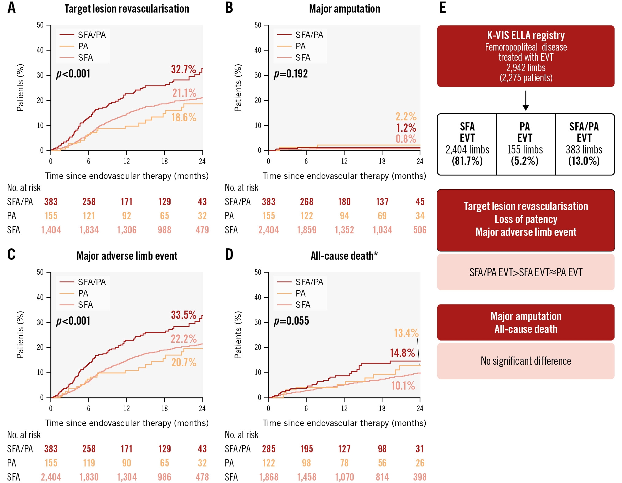 Central illustration. Clinical outcomes of endovascular therapy for femoropopliteal disease over a 2-year period based on treatment extent. *Analysis based on patient-level data. Kaplan-Meier curves for the following clinical outcomes: target lesion revascularisation (A), major amputation (B), major adverse limb event (C), and all-cause death (D). E) summarises the study results. EVT: endovascular therapy; PA: popliteal artery; SFA: superficial femoral artery