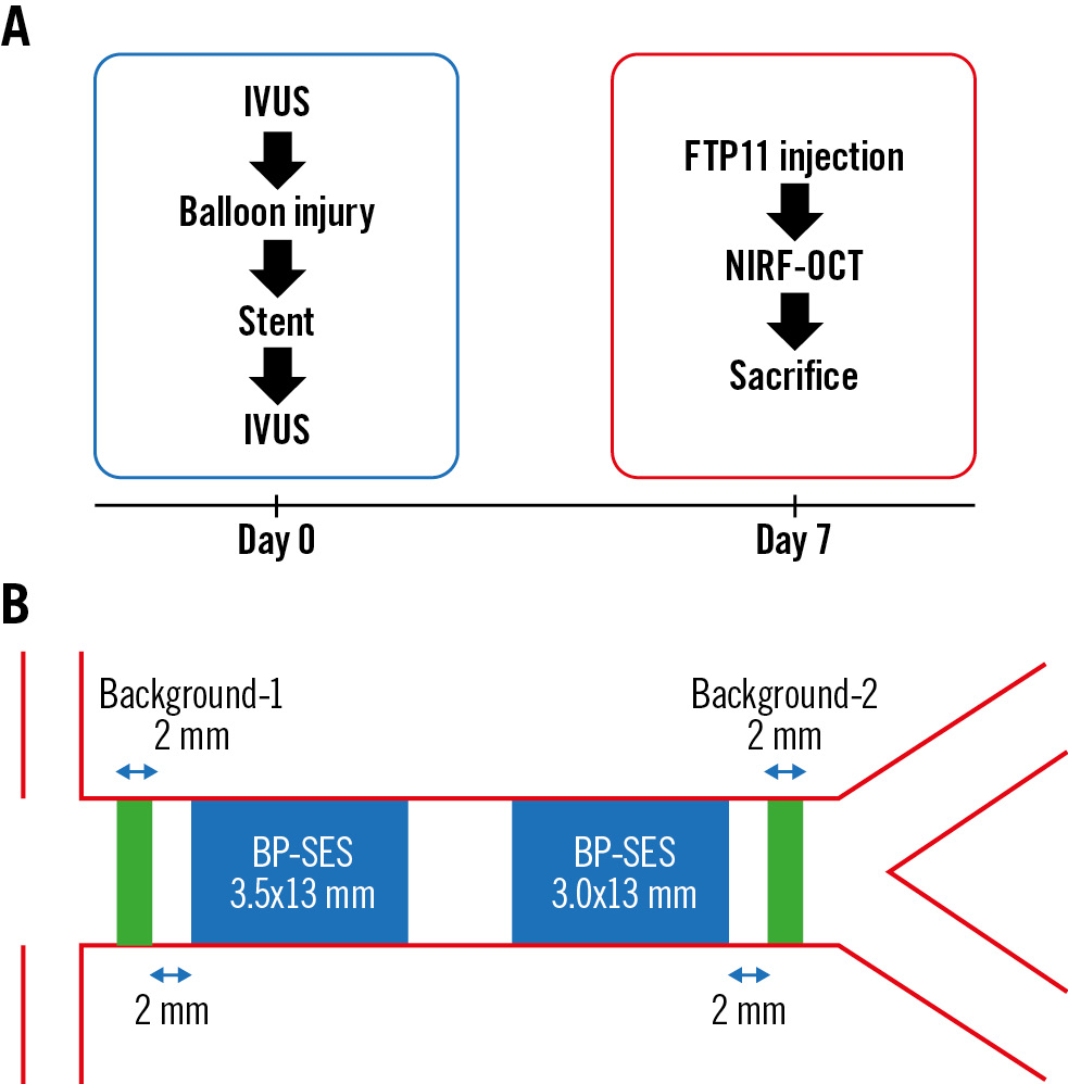 Figure 1. Preclinical study design comparing subacute stent-healing features of ultrathin-strut and thin-strut BP-SES. A) Eight rabbits underwent implantation of non-overlapping thin-strut 3.5x13 mm and ultrathin-strut 3.0x13 mm BP-SES in the rabbit aorta and postdilated with a 3.5 mm non-compliant balloon to obtain a stent expansion ratio of 1.1-1.2 under IVUS guidance. On day 7, intravascular in vivo NIRF-OCT assessed stent healing 2 hours after intravenous FTP11-CyAm7 fibrin molecular imaging agent injection. B) The NIRF target-to-background ratio (TBR) was calculated for each stent, with the background signal averaged between at the stent proximal and distal zones 2 mm away from the stents, as indicated in green. BP-SES: biodegradable-polymer sirolimus-eluting stent; IVUS: intravascular ultrasound; NIRF: near-infrared; OCT: optical coherence tomography