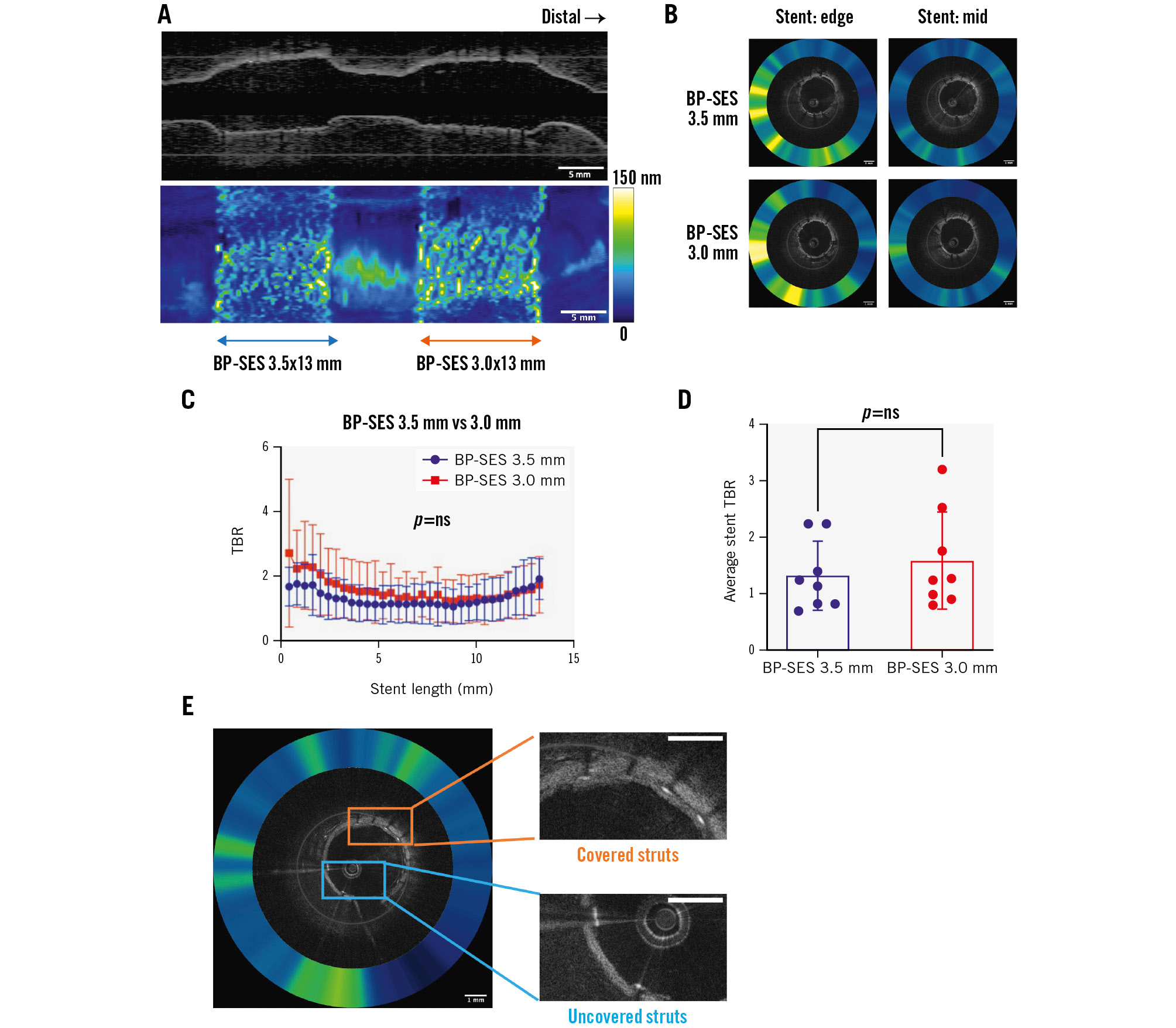 Figure 2. Fibrin deposition on ultrathin-strut versus thin-strut BP-SES as assessed by NIRF-OCT molecular-structural imaging. In vivo two-dimensional fibrin NIRF-OCT map at day 7 post-stent implantation of non-overlapping 3.5 mm and 3.0 mm BP-SES. A) Long-axis NIRF image and (B) cross-sectional NIRF-OCT image, where the coregistered NIRF fibrin signal intensity is displayed as a quantitative ring around the OCT image. C) The NIRF fibrin signal plotted from the proximal to distal stent edge of BP-SES 3.5x13 mm and BP-SES 3.0x13 mm, averaged from the 8 rabbits (n=8 stents per group). D) The average of NIRF fibrin TBR across each 13 mm stent length. E) Representative NIRF-OCT images of covered and uncovered stent struts. Scale bar: 5 mm (long-axis NIRF image) or 1 mm (cross-sectional NIRF-OCT image). BP-SES: biodegradable-polymer sirolimus-eluting stent; NIRF: near-infrared fluorescence; ns: non-significant; OCT: optical coherence tomography; TBR: target-to-background ratio