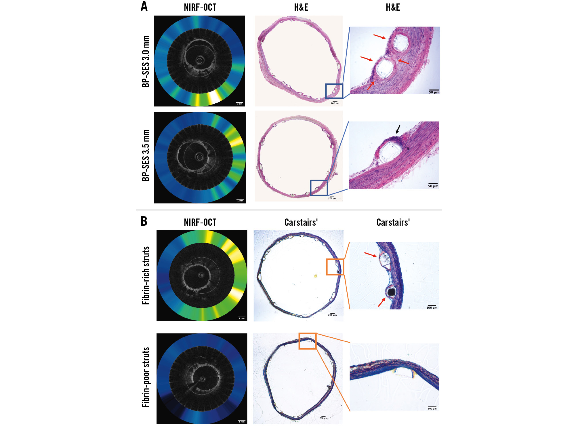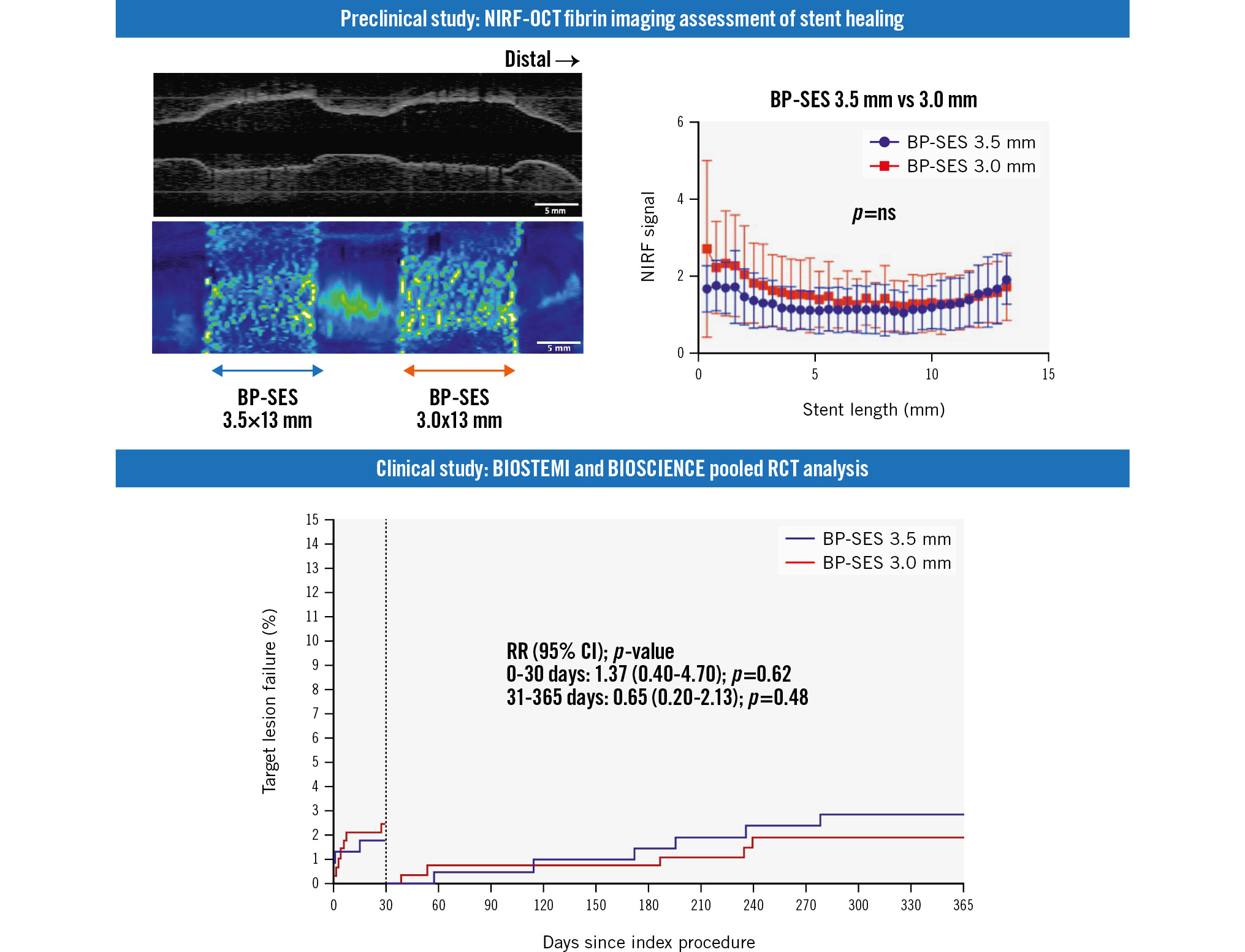 This study has limitations. Experimentally, stent healing was assessed in normal rather than atheroma-bearing rabbit arteries, consistent with prior preclinical stent healing studies27 and, thus, may not recapitulate all features of stent healing in patients. In addition, stent deployment at day 0 was assessed with only IVUS and not OCT. Although OCT is preferred for assessing post-stenting malapposition, in a rabbit, OCT is more invasive than IVUS, because it requires a separate arterial access via the carotid artery cutdown to allow for balloon occlusion and blood clearance. Considering the degree of invasiveness, which could risk animal death, and the need to preserve an arterial access for the day 7 primary endpoint, we deferred OCT on day 0 and performed IVUS pullback only. While DP-EES were not experimentally studied for stent healing, the focus of this study was to assess the impact of the specific parameter of strut thickness between otherwise similarly constructed stents. We could not compare preclinical ultrathin-strut versus thin-strut stent healing in smaller vessels (e.g., 2.5 mm diameter) due to the risk of dissection with the larger 3.5 mm platform, and, intentionally, the clinical analysis matched the 3.0 mm/3.5 mm preclinical framework. Another limitation was that we could not specifically compare healing of the same diameter stent with thin-strut versus ultrathin-strut thickness in large arteries (e.g., a 3.5 mm BP-SES with 60 μm vs a 3.5 mm BP-SES with 80 μm strut thickness), nor in smaller arteries (e.g., a 2.5 mm BP-SES with 60 μm vs a 2.5 mm BP-SES with 80 μm strut thickness) that typically have poorer outcomes20, as the manufacturer only provides 1 strut thickness for a given stent diameter. The latter inability to compare small-diameter vessel healing and outcomes between ultrathin-strut and thin-strut BP-SES remains a limitation, as it is still possible that ultrathin-strut thickness could confer an advantage in smaller-diameter arteries. However, it is also noteworthy that for 3.0 mm diameter vessels, ultrathin-strut BP-SES showed numerically higher event rates than thin-strut DP-EES (Figure 4A), again supporting the concept that ultrathin-strut thickness may not confer improved clinical outcomes in large vessels. The day 7 timepoint for preclinical assessment was chosen based on the BIOSTEMI trial showing benefits emerging by 30 days post-PCI; later timepoints might reveal differences in stent healing, although prior preclinical data shows smaller differences in stent coverage and fibrin deposition at later timepoints such as day 281027. While the NIRF-OCT fibrin/coverage imaging protocol was focused on assessing subacute stent healing, separate preclinical studies might evaluate neointimal hyperplasia and neoatherosclerosis at later timepoints, features that could also underlie the improved TLF rates noted with BP-SES. In the BIOSTEMI and BIOSCIENCE trials, patients were not randomised to receive thin-strut versus ultrathin-strut stents of otherwise similar stent designs, and were not randomised based on the presence or absence of a bifurcation lesion. Finally, the present analysis included a small number of patients (n=3) who underwent PCI with a single ultrathin-strut BP-SES that overlapped a previously implanted non-study stent. While PCI with overlapping stents may induce different arterial wall response patterns than those caused by single stent implantation, the inclusion of a limited number of patients with overlapping stents in the present analysis is unlikely to have influenced the overall study results.