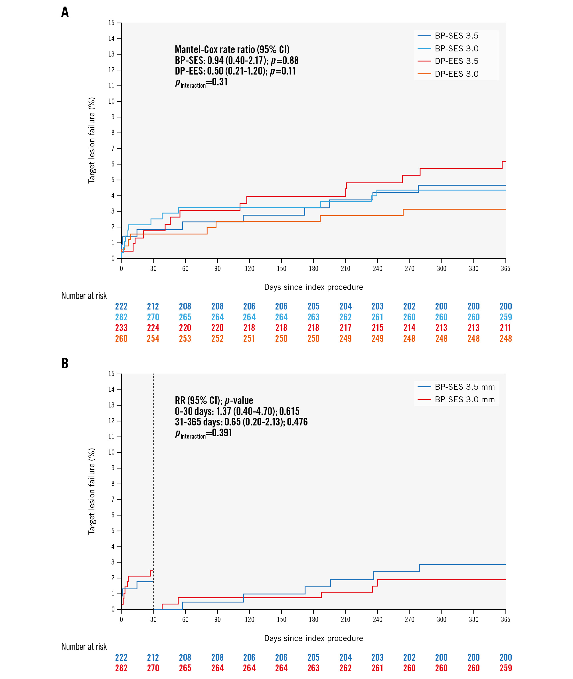 Figure 4. Clinical outcomes of 504 pooled patients from the BIOSCIENCE and BIOSTEMI trials treated with either a 3.0 mm diameter or 3.5 mm diameter BP-SES or DP-EES. A) Time-to-event curves for target lesion failure (TLF) at 1 year of follow-up for all 4 groups. Blue line: thin-strut BP-SES (diameter 3.5 mm; strut thickness 80 μm); light blue line: ultrathin-strut BP-SES (diameter 3.0 mm; strut thickness 60 μm); red line: thin-strut DP-EES (diameter 3.5 mm; strut thickness 81 μm); orange line: thin-strut DP-EES (diameter 3.0 mm; strut thickness 81 μm). B) Time-to-event curves for 1-year TLF events in the two BP-SES groups, with a landmark set at 30 days. Blue line: thin-strut BP-SES (diameter 3.5 mm; strut thickness 80 μm); red line: ultrathin-strut BP-SES (diameter 3.0 mm; strut thickness 60 μm). BP-SES: biodegradable-polymer sirolimus-eluting stent; CI: confidence interval; DP-EES: durable-polymer everolimus-eluting stents; RR: risk ratio